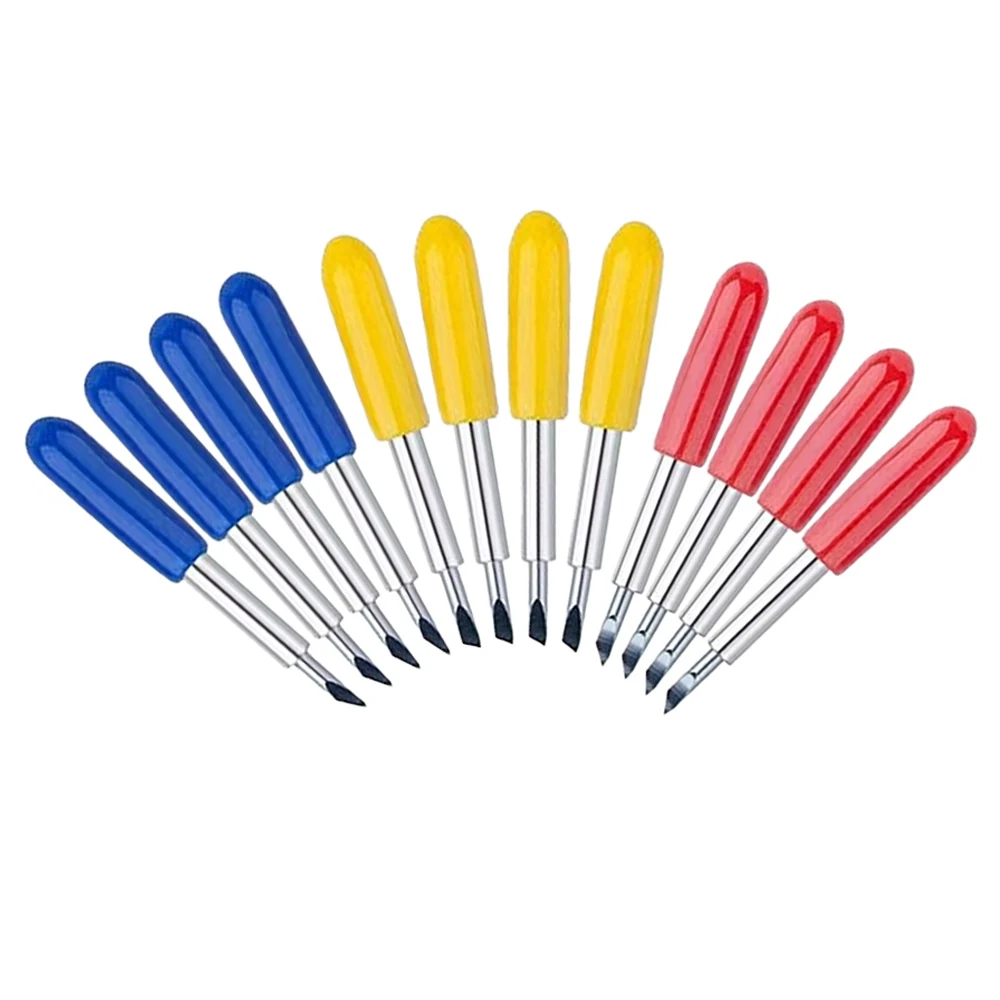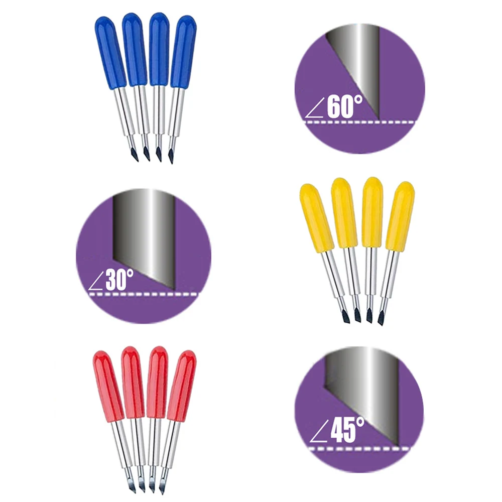12 сменных лезвий всего, включая 4 стандартных лезвий 45 градусов (красный), 4 лезвий 60 градусов глубокой резки (синий), 4 лезвий 30 градусов (желтый)