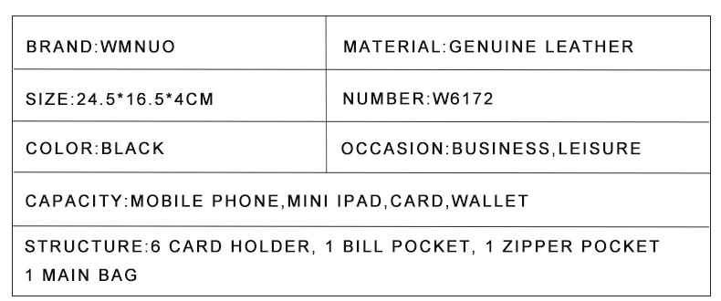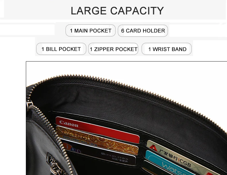 Наименование товара: мужские сумки-клатчи Wmnuo из натуральной коровьей кожи, Большая мягкая сумка на молнии для мужчин, дизайнерские кошельки, сумка-конверт, карман для телефона, черный цвет Материал: Высококачественная коровья натуральная кожа Размеры: 24,5*16,5*4 см Емкость: мобильный телефон, карта, кошелек, мини Ipad Структура: 6 держатель для карт, 1 карман для купюр, 1 Основная сумка, 1 карман на молнии Цвет: черный Обратите внимание: 1. В связи с использованием различных методов измерения, возможны отклонения в размере от 1 до 3 см вследствие измерений вручную.(1 дюйм = 2,54 см; 1 см = 0,39 дюйма) 2. Из-за различных настроек монитора цвет изображения может немного отличаться от фактического цвета продукта.