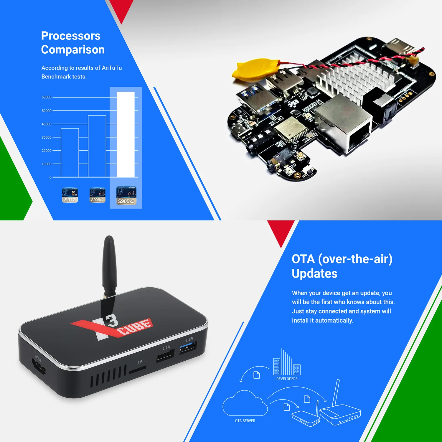 S905X3 64-разрядным четырёхъядерным чипсет, cortex-A55 Процессор, поддержка TF карты расширения памяти.