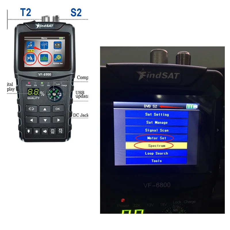 Напоминание: набор моторов и меню спектра были перемещены в подменю DVB S2. Это страница действия после обновления. Это отличается от изображения коробки. При новом обновлении модель VF-6800 будет обновлена.