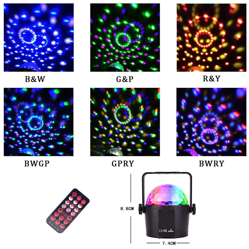 Материал: переменный ток + АБС Название: светодиодный RGB Кристалл магический шар световой эффект светодиодный источник света цвет: RGB 6*1 Вт Разъем питания: AC85-265V 50-60 Гц (ЕС/США) Номинальная мощность: 7 Вт Режим управления: дистанционное управление/Авто/голос (Автоматическая идентификация) Размер продукта: 8,8*7,4 см Вес: 0,26 кг