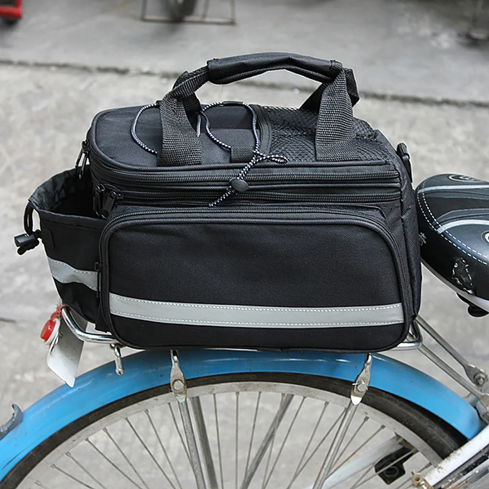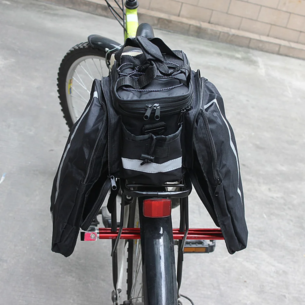 Особенности: Со светоотражающими полосками для безопасности. Состоит из 3 основных частей: две боковые растяжимые сумки и одна Средняя сумка. Один мягкий съемный отсек для средней сумки. Внутри и снаружи сетчатые мешки на верхней крышке. Поставляется со съемными и регулируемыми лямками. (длина: макс. 1,25 м/4,1 фут) Верхняя рукоятка с накладкой. Полностью оборудована 2-сторонней застежкой-молнией. Держатель бутылки на одной стороне с регулируемым поясом. Поставляется с дождевой крышкой (в случайном цвете), прикрепленной в нижней части. Быстро Отпустите или прикрепите велосипедную стойку bys и taches.