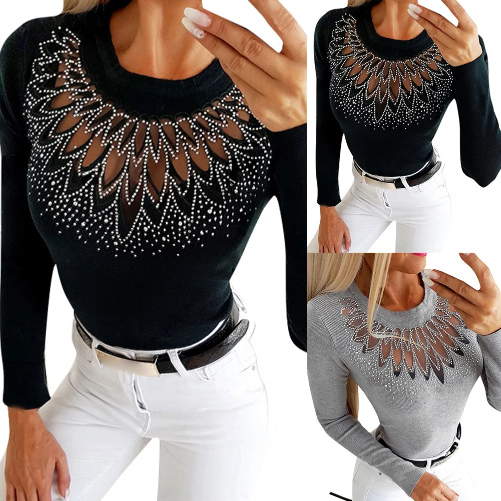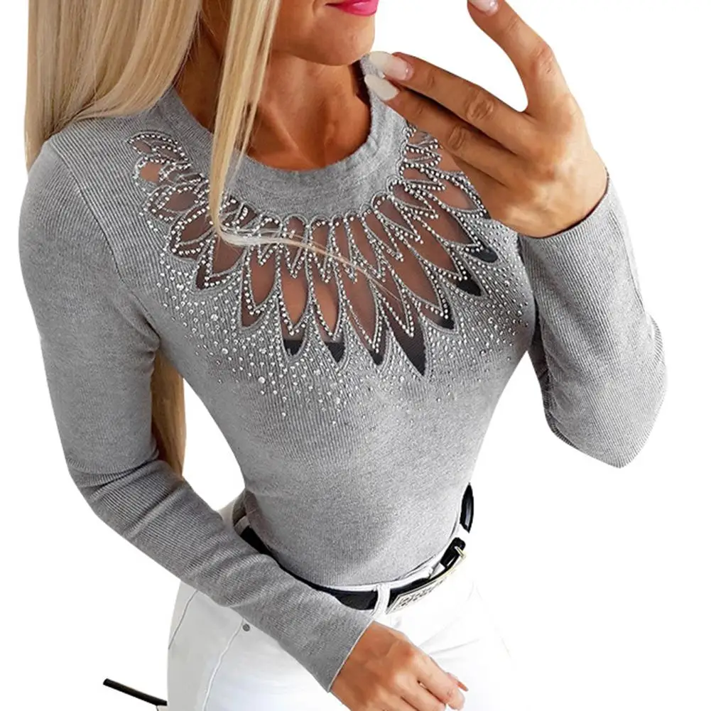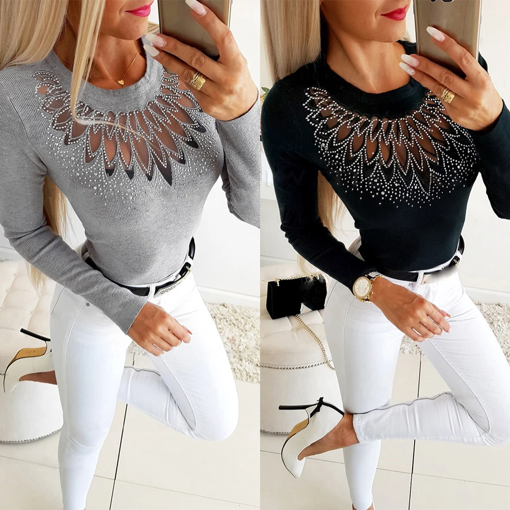Пикантная Женская Осенняя блузка с вырезами, однотонные Стразы, Декор, черный, серый цвет, облегающая блузка на талии, пуловер, ropa mujer blusas