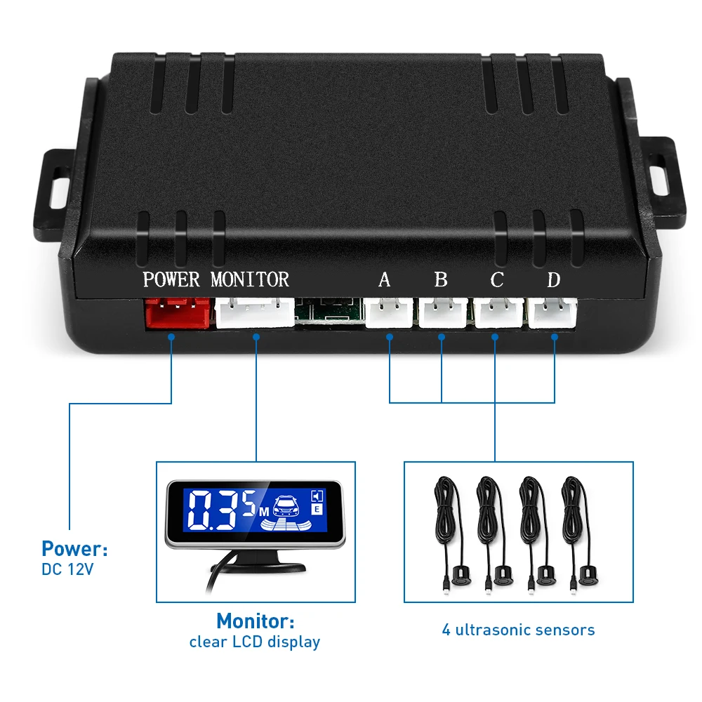 -4 ультразвуковых датчика: Включает в себя 4 ультразвуковых датчика с улучшенной производительностью обнаружения, анти-замораживание, водонепроницаемость и ударопрочность, которые могут быть легко установлены в вашем автомобиле. -ЖК-дисплей дисплей: Определенная дистанция между автомобилем и препятствиями будет показана на этом экране четко. И он также предоставляет вам звуковое предупреждение для безопасности вождения. -Поворачивающаяся на 360 градусов конструкция: Основание этого ЖК-дисплея поворачивается на 360 градусов. Вы можете настроить его свободно, чтобы дать вам оптимальный угол обзора. -Повышение уровня безопасности: Наша парковочная радиолокационная система умно обнаруживает детей и низких стен, что обеспечивает повышенную безопасность для пассажиров, пешеходов и членов семьи, которые случайно находятся вокруг движущегося транспортного средства. -Простота установки: С помощью одной универсальной кольцевой пилы просто используйте дрель для сверления отверстий на заднем/переднем бампере вашего автомобиля, чтобы удобно установить эти ультразвуковые датчики.