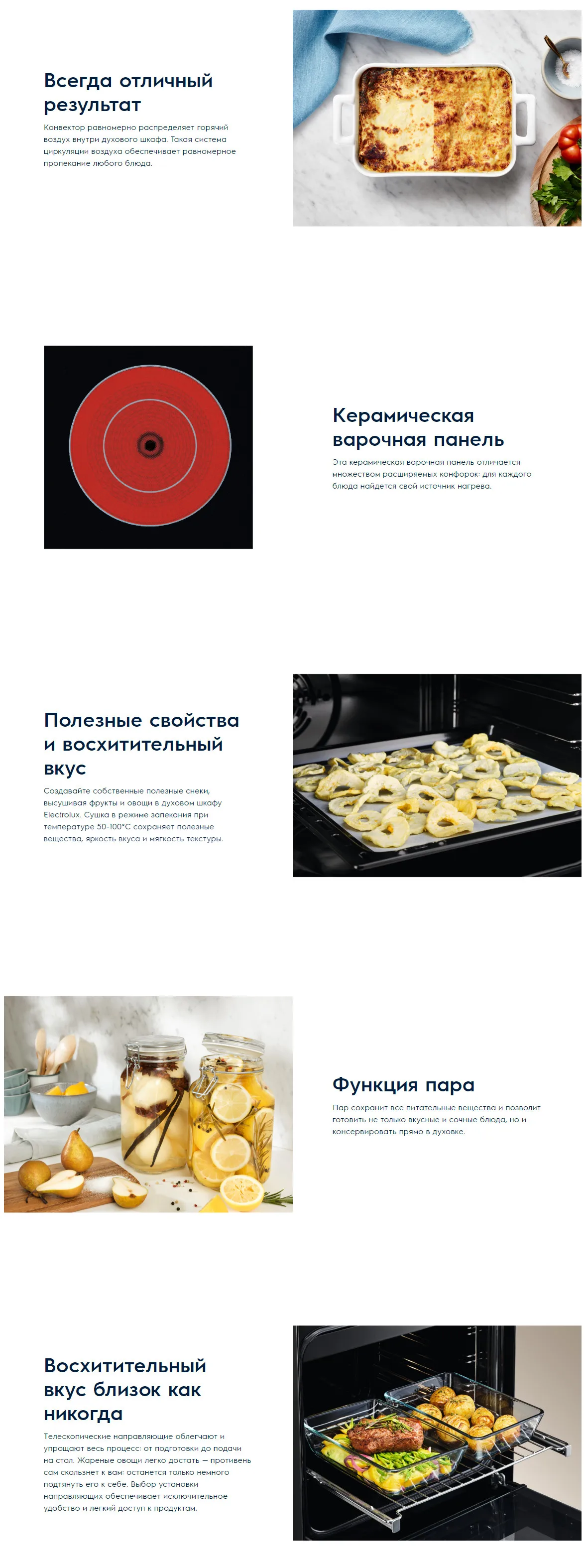 ВЭлектрическая плита со стеклокерамической варочной поверхностью Electrolux EKC954908K. Детали Плита с электрической духовкой и электрическими варочными зонами Варочная поверхность: Стеклокерамическая Индикация остаточного тепла для варочных зон: Есть Управление четырьмя варочными зонами Легкая очистка дверцы духовки Отверстие для отвода пара Ящик для хранения принадлежностей Функции духовки: Нижний нагрев, Разморозка, Вентилятор + верхний нагрев, Вентилятор + верхний нагрев + нижний нагрев (100°C), Большой гриль, Большой турбо-гриль, Освещение, Кольцевой элемент + выпариватель + вентилятор, Конвекция с кольцевым нагревательным элементом, Верхний нагрев + нижний нагрев, Верхний нагрев + нижний нагрев + вентилятор Функции духовки: Нижний нагрев, Разморозка, Вентилятор + верхний нагрев, Вентилятор + верхний нагрев + нижний нагрев (100°C), Большой гриль, Большой турбо-гриль, Освещение, Кольцевой элемент + выпариватель + вентилятор, Конвекция с кольцевым нагревательным элементом, Верхний нагрев + нижний нагрев, Верхний нагрев + нижний нагрев + вентилятор Функции нижней духовки: Производительность Очистка: Эмаль лёгкой очистки Установка Цвет: Чёрный Предохранители, А: 3x16 Вилка: Нет Энергия Общая потребляемая мощность, Вт: 8605.4 Класс энергоэффективности: A Класс энергоэффективности: No SecGenEConskWhCM: 0.84 Другие Тип: Электрическая плита Тип поджига конфорок: Нет Режимы приготовления: Нижний нагрев, Разморозка, Вентилятор + верхний нагрев, Вентилятор + верхний нагрев + нижний нагрев (100°C), Большой гриль, Большой турбо-гриль, Освещение, Кольцевой элемент + выпариватель + вентилятор, Конвекция с кольцевым нагревательным элементом, Верхний нагрев + нижний нагрев, Верхний нагрев + нижний нагрев + вентилятор Размеры (ВхШхГ), мм: 858x500x600 Индикаторы остаточного тепла: Есть Максимальная температура дверцы, C°: 60 Аксессуары духового шкафа: Эмалированный противень, Поддон с эмалью лёгкой очистки Решетки: Хромированная изогнутая решетка с антипригарным покрытием Функция Пара: Нет Номинальное напряжение, В: 230 Страна производства: Румыния Кабель питания: нет Тип направляющих: Легкосъёмные Количество стекол в двери: 2