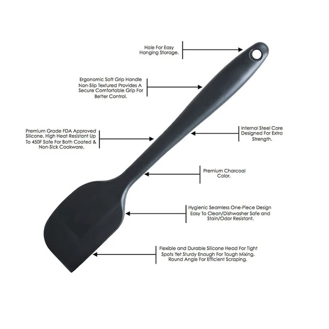 Шпатель гибкий и гигиеничный, что делает его идеальным для домашнего и профессионального использования. Имеет удобное ушко для креативных решений для хранения. Прочный и термостойкий до 600 градусов по Фаренгейту эргономичный дизайн и вес, идеально подходит для кухонной посуды. Безопасен на кухонной утвари, не поцарапает вашу утварь. Удобно лежит в руках.