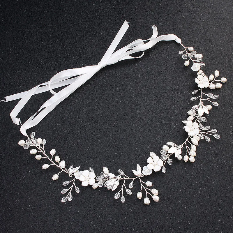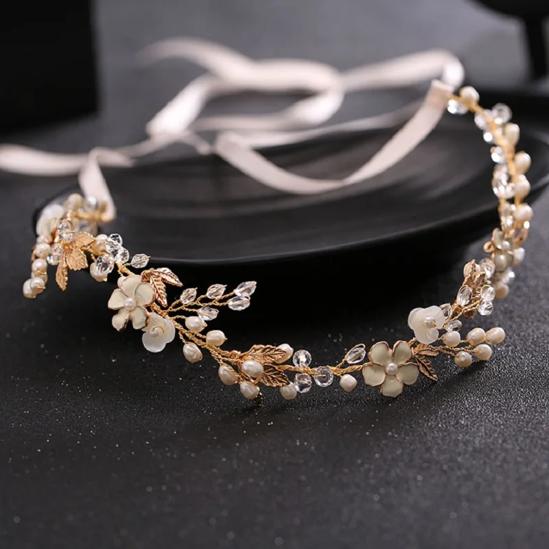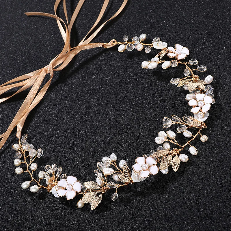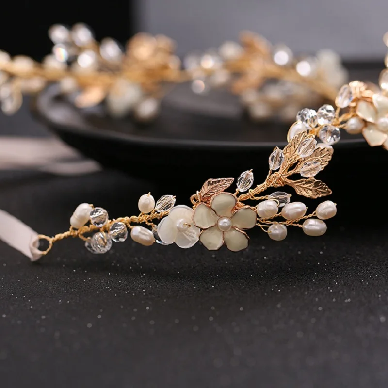 Великолепная ручная работа, Золотой лист, Пресноводный Жемчуг, цветок, свадебная повязка на голову, лоза для волос, свадебные аксессуары для волос, Женские Ювелирные изделия Материал: цинковый сплав, стразы, кристаллы, Пресноводный Жемчуг Размер: 35 см длина * 2 см ширина Случаи: ежедневное использование, свадьба, вечерние, помолвка, фото