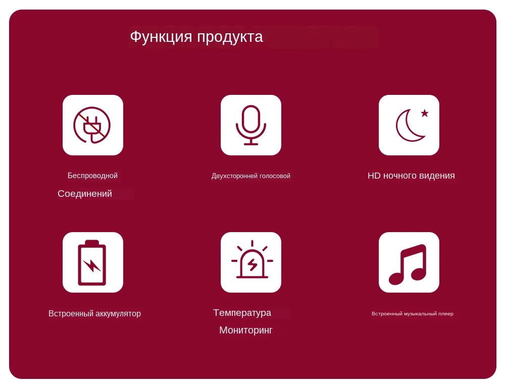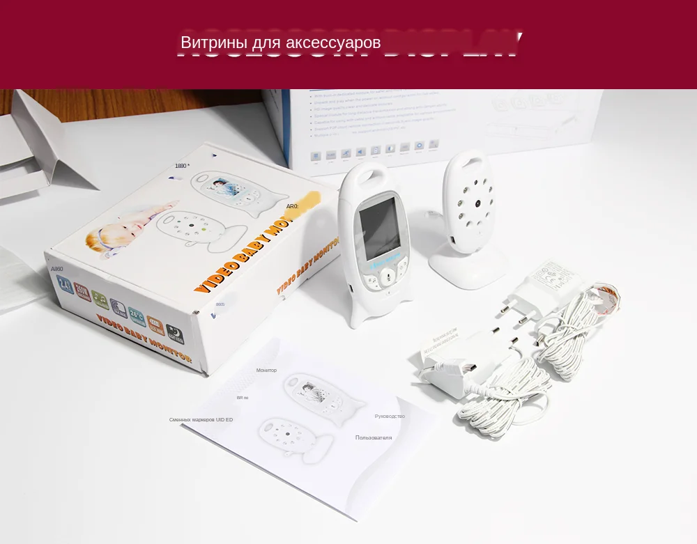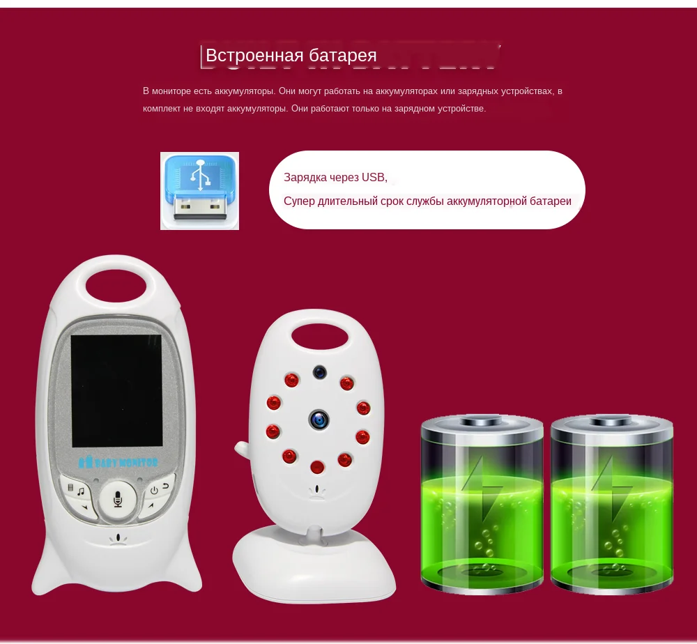 Особенности: Беспроблемный портативный мониторинг Двусторонний (разговор) Температура мониторинга Встроенные 8 колыбельных в камеру Автоматическое ночное видение Безопасный, без помех, дальний цифровой сигнал Высококонтрастный цветной ЖК-монитор 2,0 дюйма Длительное время работы от аккумулятора (10 часов в режиме Vox) Поддержка нескольких языков (английский/французский/испанский/итальянский/немецкий/португальский/русский/Турецкий) Встроенные колыбельные могут помочь родителю утешить малыша, засыпающего. Знайте комнатную температуру вашего ребенка весь день без беспокойства! Двусторонний звук между камерой и монитором, вы можете поговорить с ребенком. Следите за ребенком всю ночь с автоматическим ночным видением Не нужно заряжать батарею для монитора всю ночь в режиме Vox Параметры: Частота передачи: ISM 2400 ~ 2483,5 МГц Передача Мощность: 17dBm Свободный эффективный диапазон: 160 футов/50 м Крытый/850 футов/260 м Открытый, прямой видимости Широкий спектр: AFH и TDMA Режим модуляции: GFSK Рабочая температура: 14 ~ 122 ° по Фаренгейту/- 10 ~ + 50 ° по Цельсию Рабочая влажность: <85% Монитор: Размер ЖК-дисплея: 2,0 дюйма Поддерживаемое разрешение: 220x176 Чувствительность приема: -90 дБм Потребляемый ток (макс.): 150 мА Аккумулятор: литий-полимерный/400 мАч, 3,7 в Источник питания: 5 В/500 мА постоянного тока Размеры (Ш x В x Г): 63 мм x 126 мм x 27 мм Камера: 1. Датчик изображения: CMOS 2. Общее изображение пикселей: 320x240pxl 3. Минимальная освещенность: 0 лк (ИК) 4. Расстояние ночного видения: 15 футов (5 м) 5. Угол обзора: Диагональ 31 ° 6. Потребляемая мощность (макс.): 100 мА 7. Источник питания: 5 В/500 мА постоянного тока 8. Размеры (Ш x В x Г): 60 мм x 102 мм x 60 мм Монитор имеет аккумулятор внутри. Он работает от аккумулятора или зарядного устройства В комплект камеры не входит аккумулятор. Он работает только на зарядном устройстве