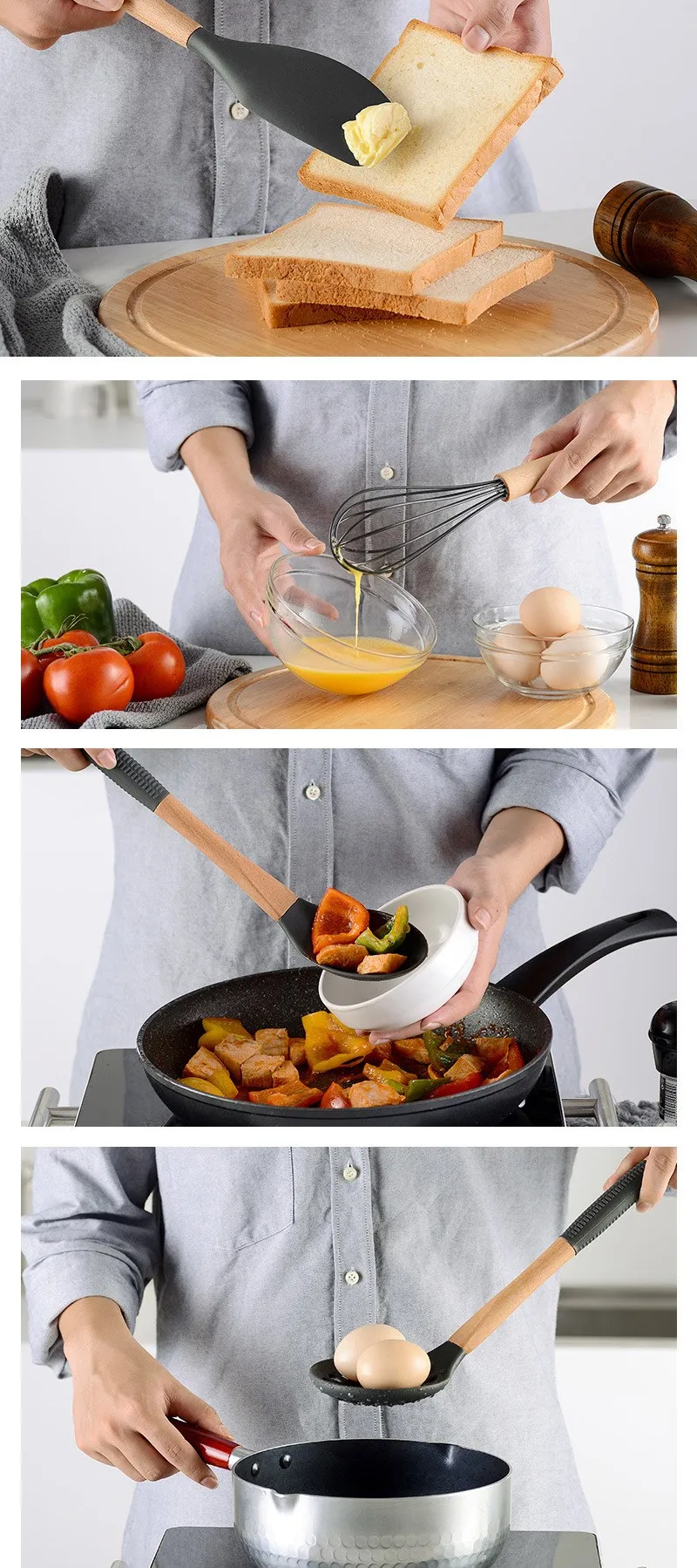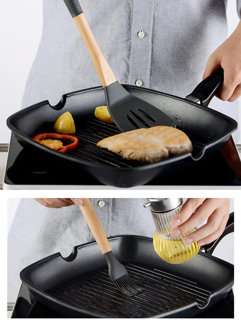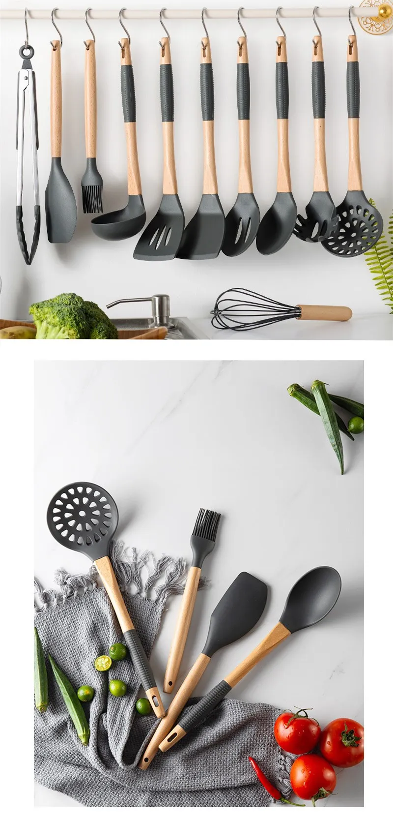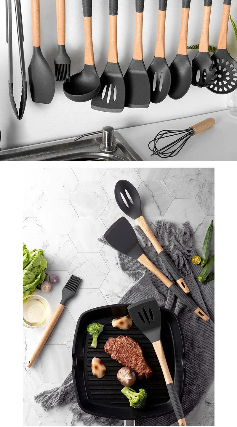 Этот набор содержит 11 кухонных инструментов для повседневного приготовления пищи. Оба изготовлены из экологически чистого силикона и дерева, которые можно использовать с уверенностью. Силикон обладает термостойкостью и не деформируется при высоких и низких температурах. Кроме того, мы также включили 10 крючков.