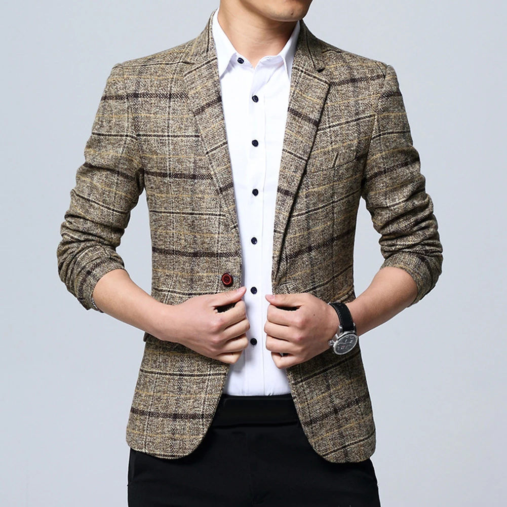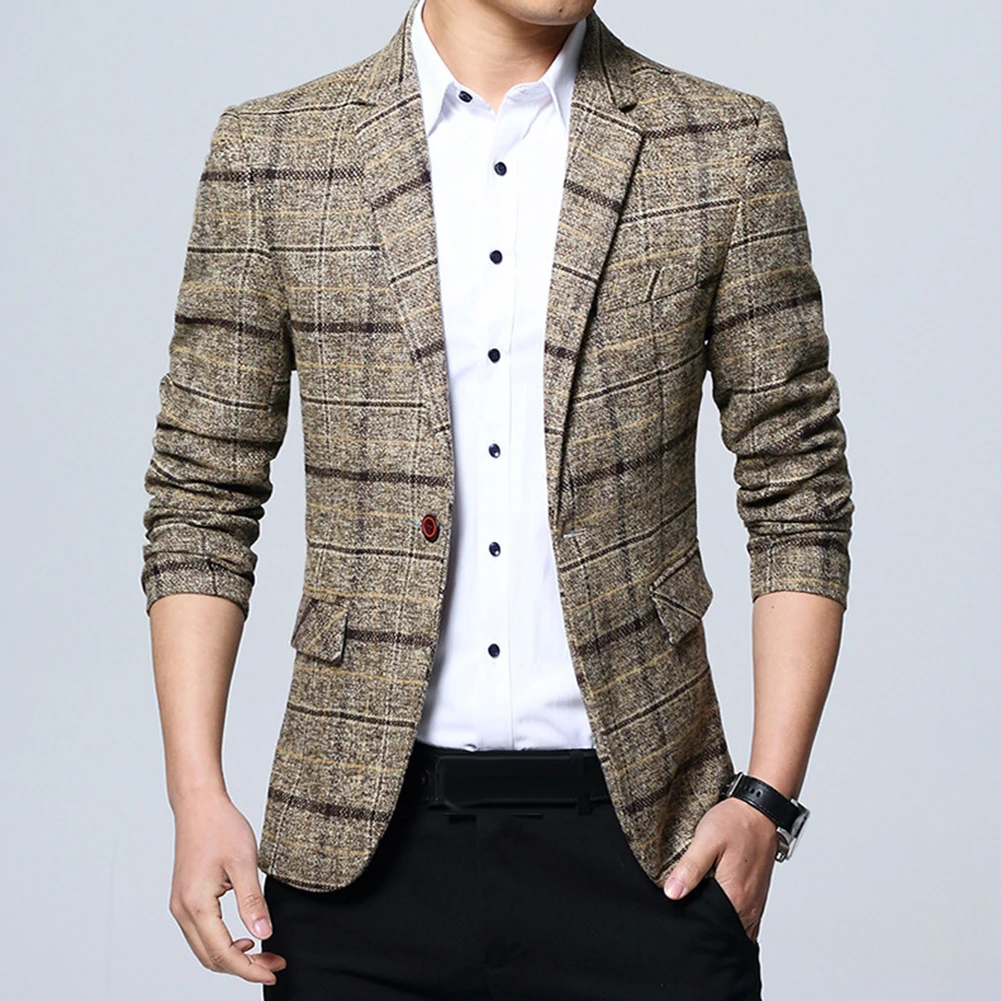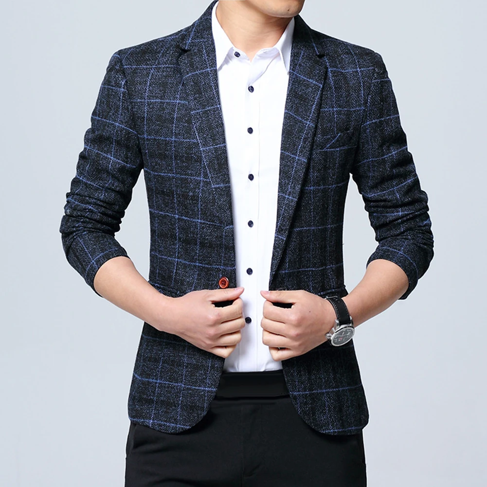 Модный мужской клетчатый пиджак с отворотом, приталенный пиджак, пиджак на одной пуговице, деловой костюм