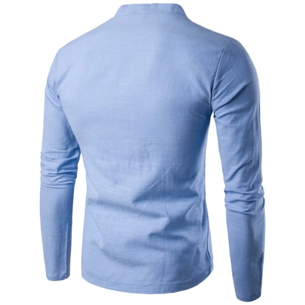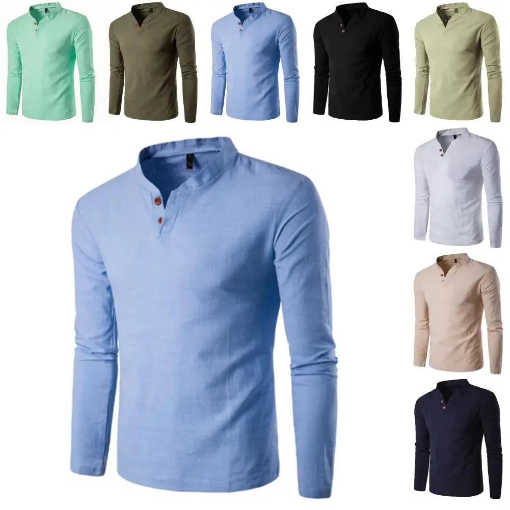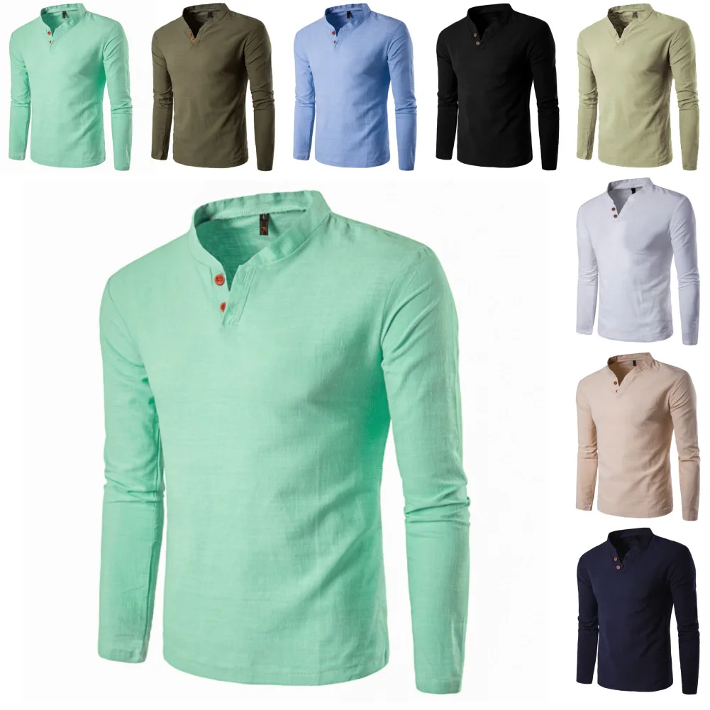 Мужская хлопковая льняная рубашка в китайском стиле с пуговицами и v-образным вырезом, длинным рукавом и воротником-стойкой