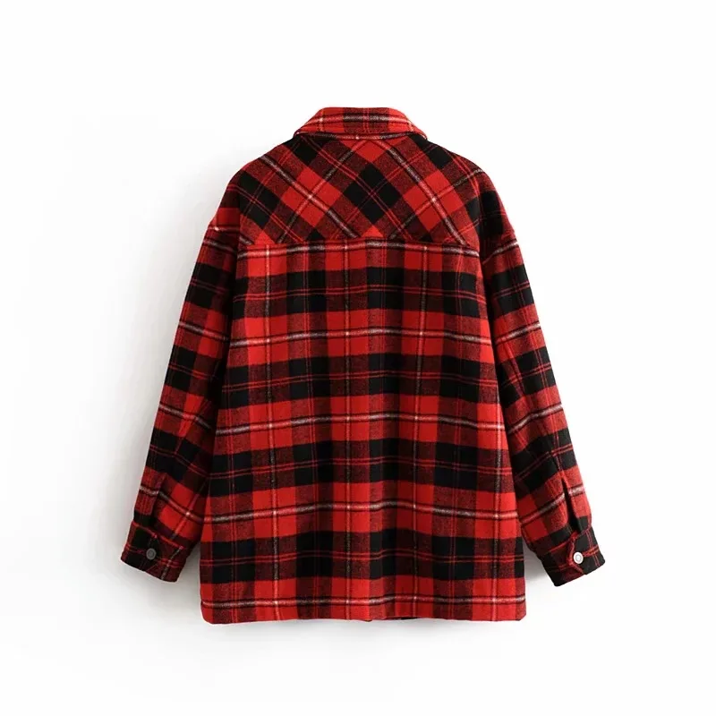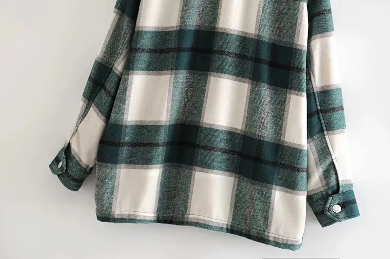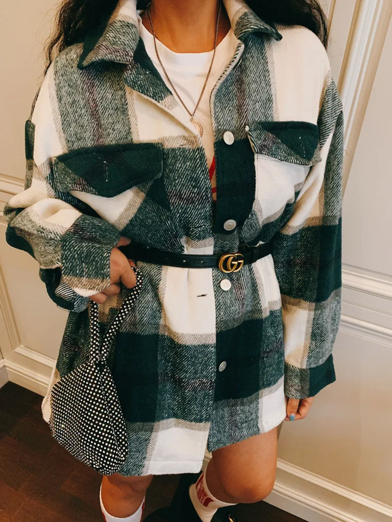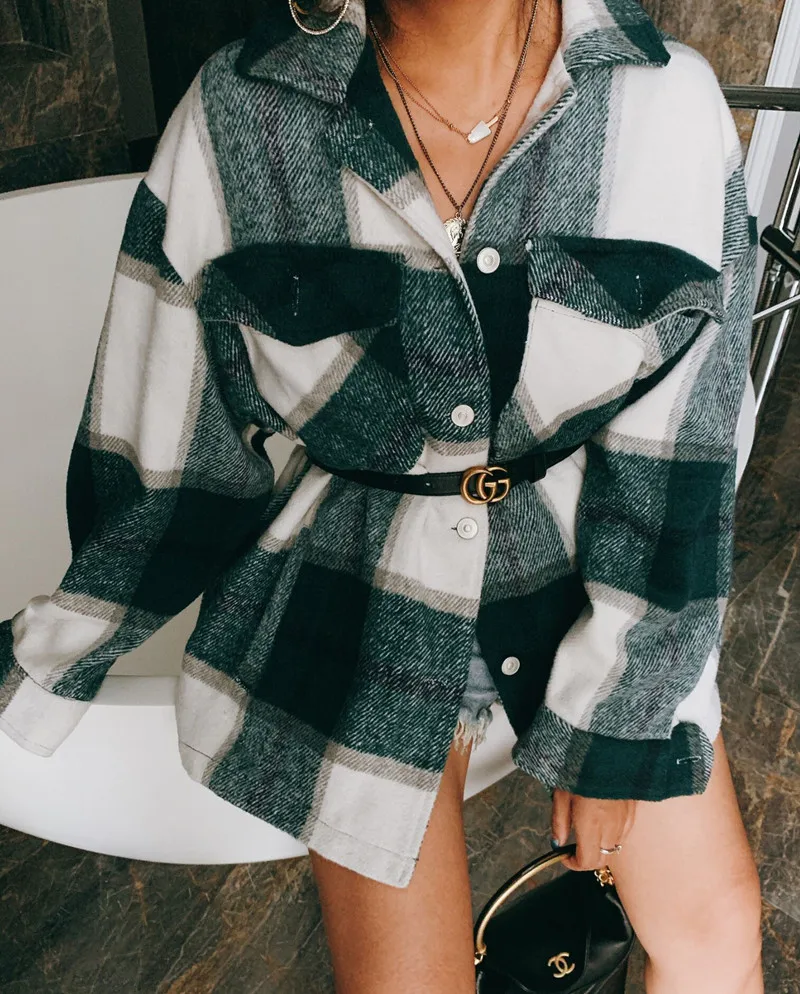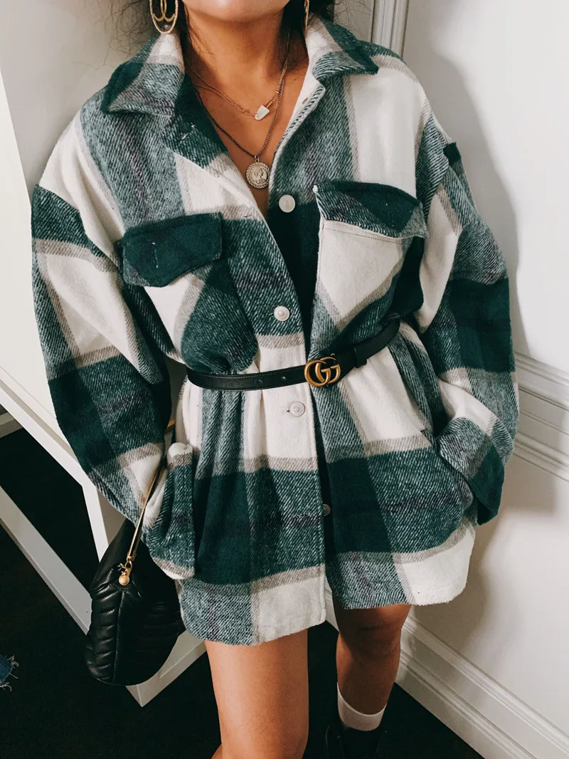 LUZUZI винтажная стильная клетчатая куртка с карманами больших размеров, пальто для женщин 2019, модный воротник с лацканами, длинный рукав, свободная верхняя одежда, шикарные топы