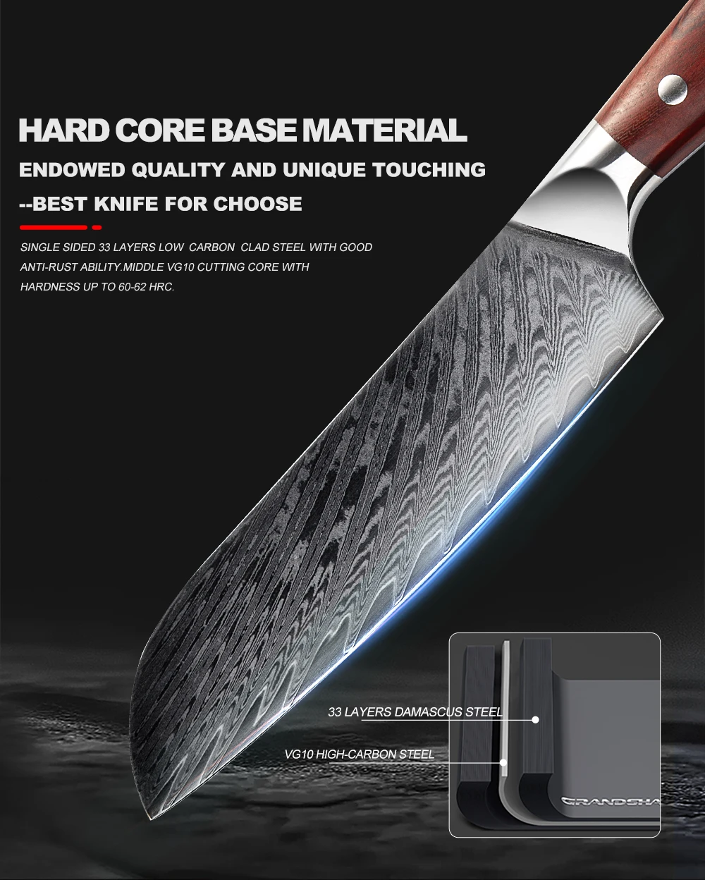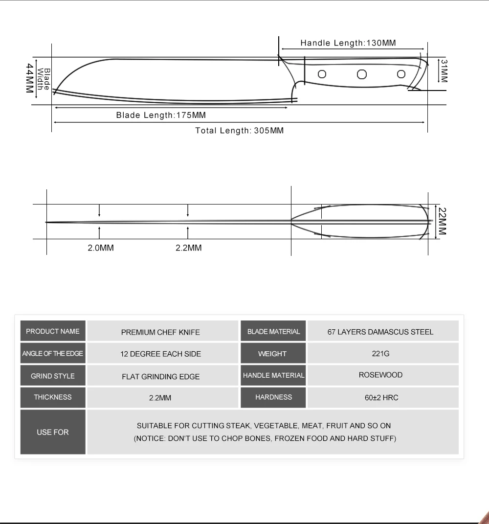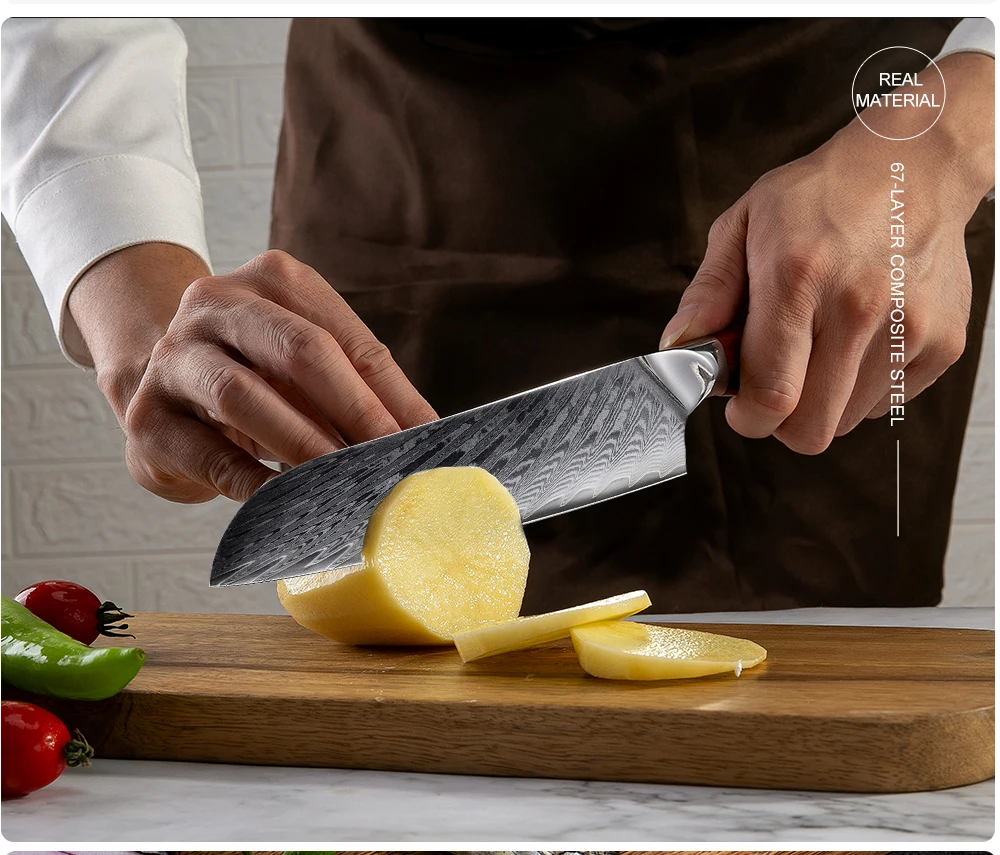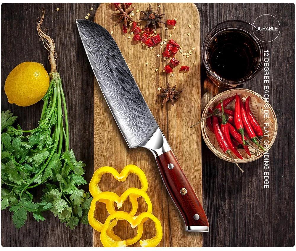 Материал лезвия: дамасская стальТвердость: 60 HRCРучка: розовое деревоВ комплект входит: нож Santoku/ножевая оболочка/Подарочная коробкаРазмеры:Длина: 305 ммДлина лезвия: 175 ммТолщина: 2,2 ммИзготовлен из 67-слой дамасской Сталь импортируется из Японии. VG-10 стальной режущий сердечник;