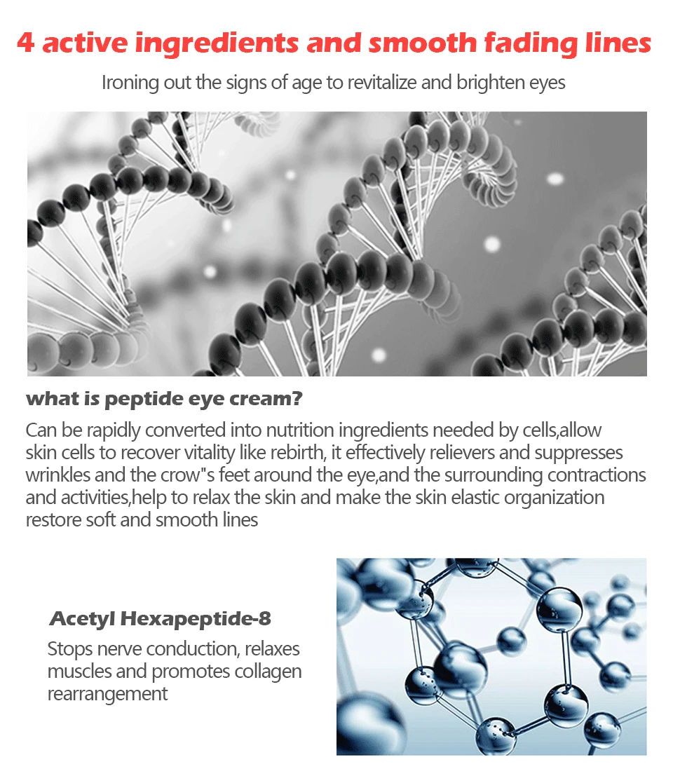 Что такое пептидный крем для глаз? Можно быстро преобразовать в пищевые ингредиенты, необходимые клеткам. lalow клетки кожи восстанавливают жизненную силу, как возрождение, эффективно избавляет и подавляет морщины и гусиные лапки вокруг глаз, а также прилегающие к ним контракционные действия, помогает расслабить кожу и сделать кожу упругой Организация восстановление мягких и гладких линий акети Hexapeptide-8 останавливает проводимость нервов, расслабляет мышцы и способствует коллагенреациям