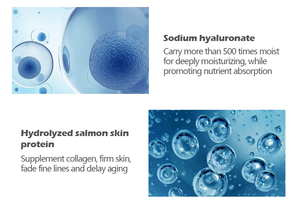 Гиалуронат натрия переносит более 500 раз увлажнение для глубокого увлажнения, стимулируя поглощение питательных веществ гидролизованный лосось, коллаген, твердая кожа, выцветание тонких линий и задержка старения