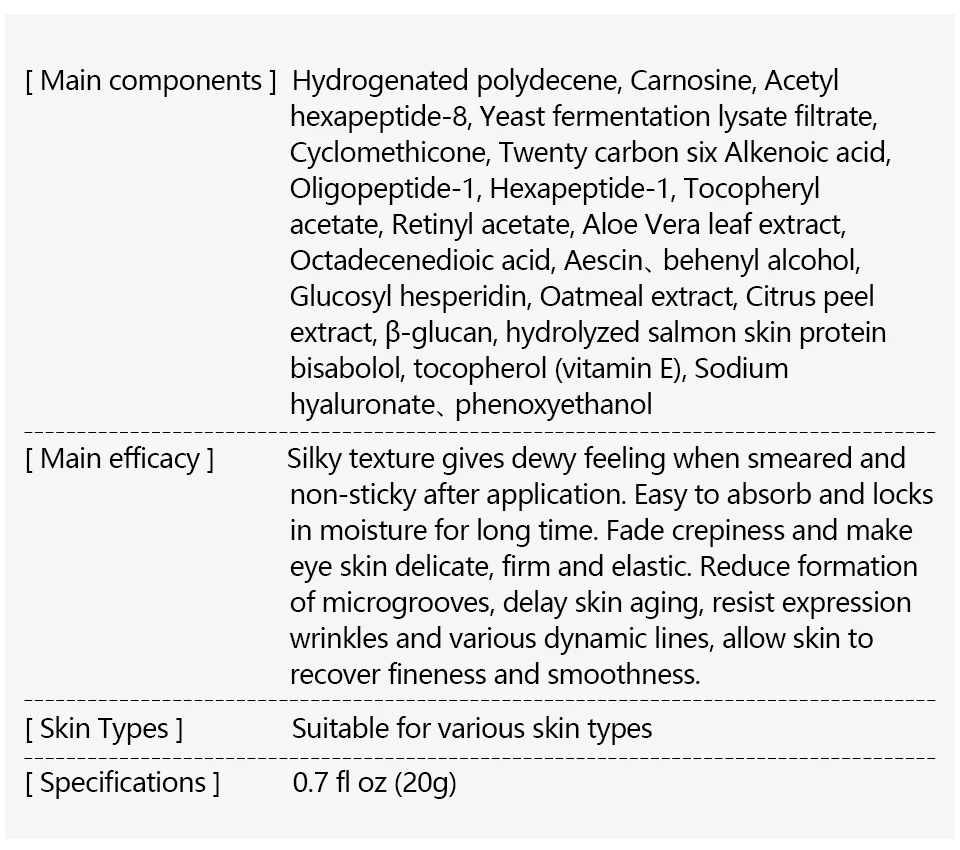 【Основные компоненты 】гидрогенизированный полидекан, Карнозин, дрожжевой брожение лизатный фильтрат, циклометикон, Twenty 1, Hexapeptide 1, Tocopherylacetate, ретинолацетат, экстракт листьев алоэ вера, acid кислота, аэсцин. бехениловый спирт, глюкозил гесперидин, экстракт овсяной муки, экстракт цитрусовых, глюкан, гидролизованный протеинбисаболол кожи лосося, токоферол (витамин е), содиумгиалуронат. феноксиэтанол. 【 Основная эффективность 】 шелковистая текстура дает ощущение росы при размазывании и не липкая после нанесения. Легко впитывает и удерживает влагу в течение длительного времени. Тускнеет и делает кожу глаз нежной, упругой и эластичной. Уменьшает форму микрожелобков, задерживает старение кожи, противостоит выраженным морщинам и различным динамическим линиям, позволяет коже переворачивать тонкость и гладкость. 【 Тип кожи 】 подходит для различных типов кожи 【технические характеристики 】 0,7 унций (20 г)