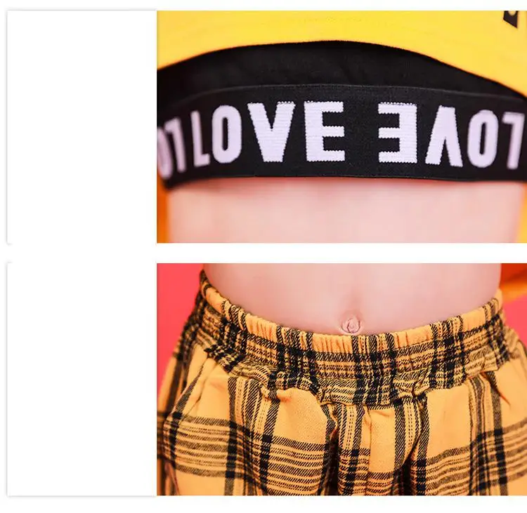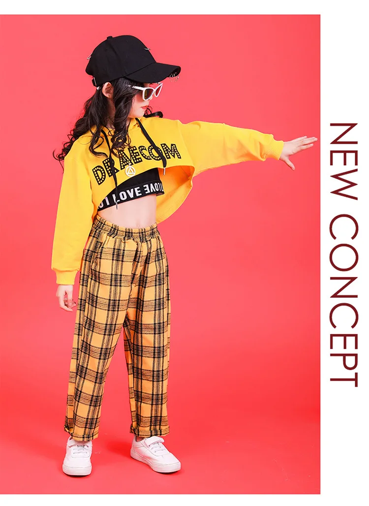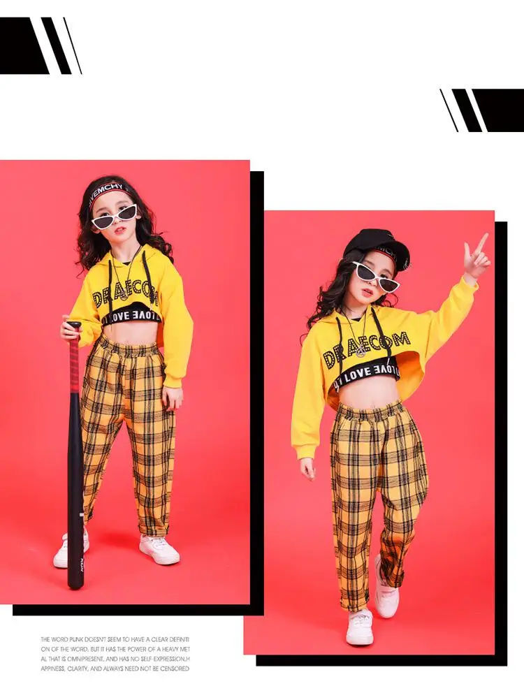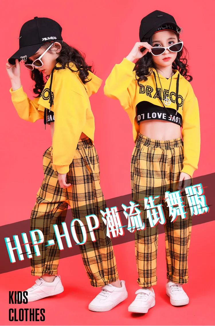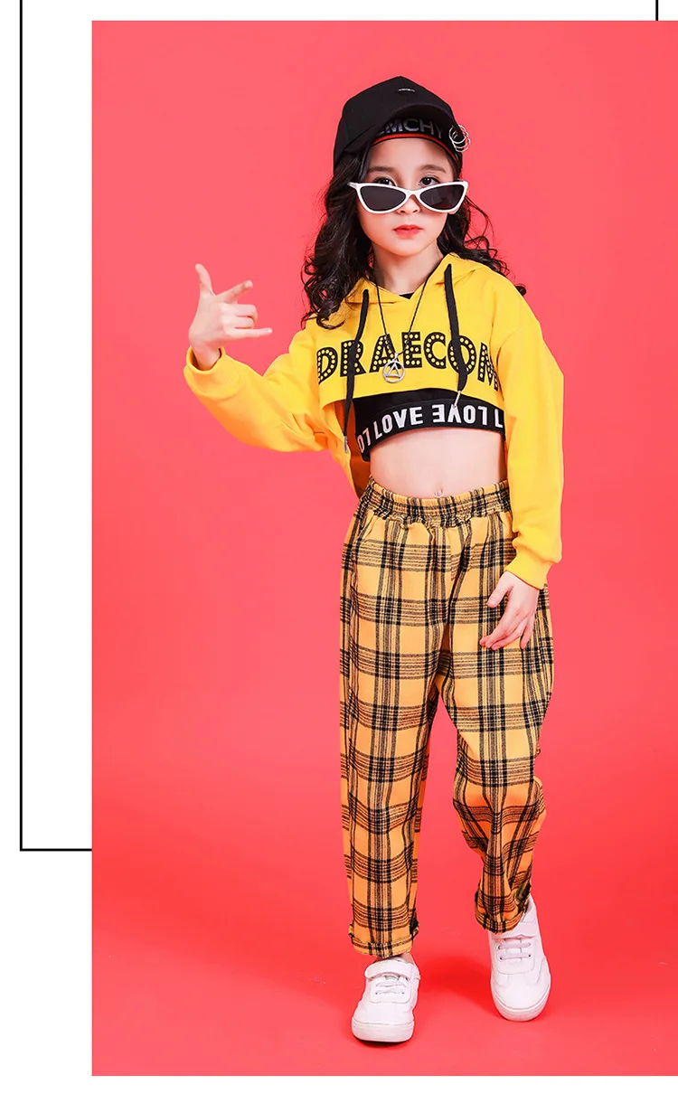 2020 Yellow Girls Boys Hip Hop Hoodies Dance Clothes for Kids Jazz Dancing Costumes T Shirt Ballroom Crop Tops Plaid Jogger Pants