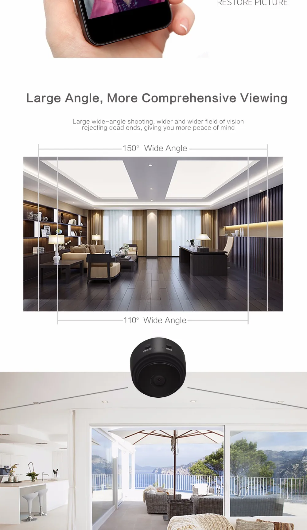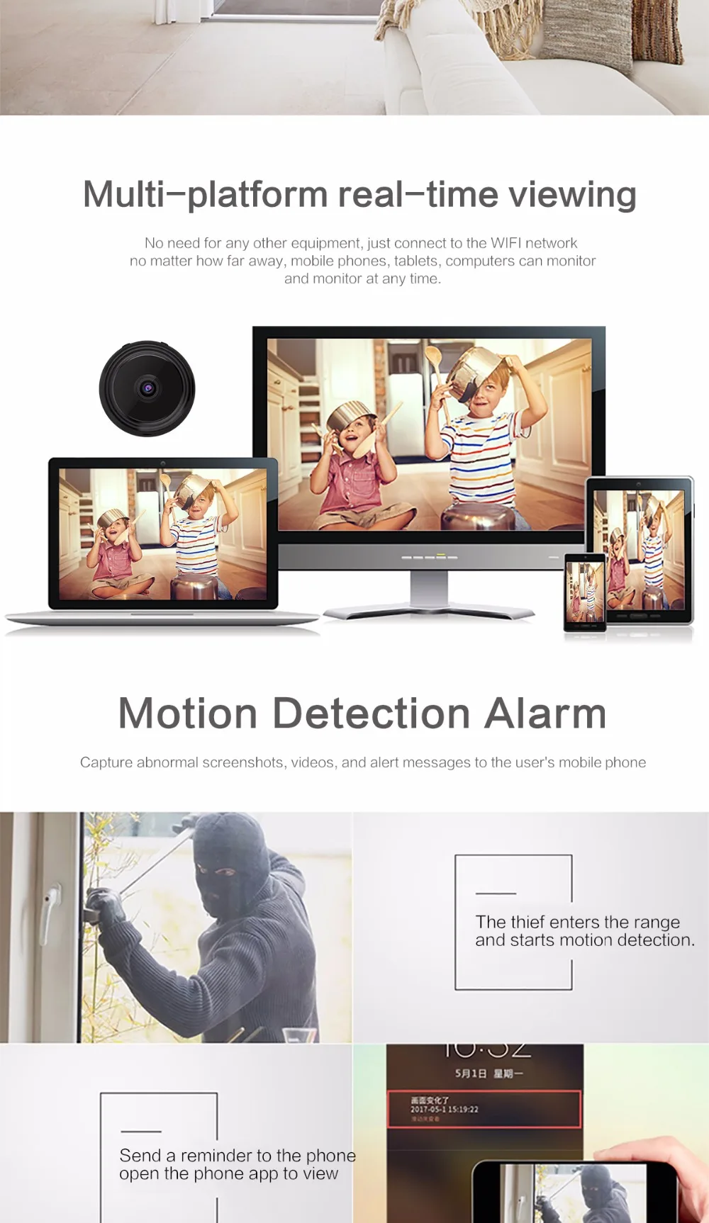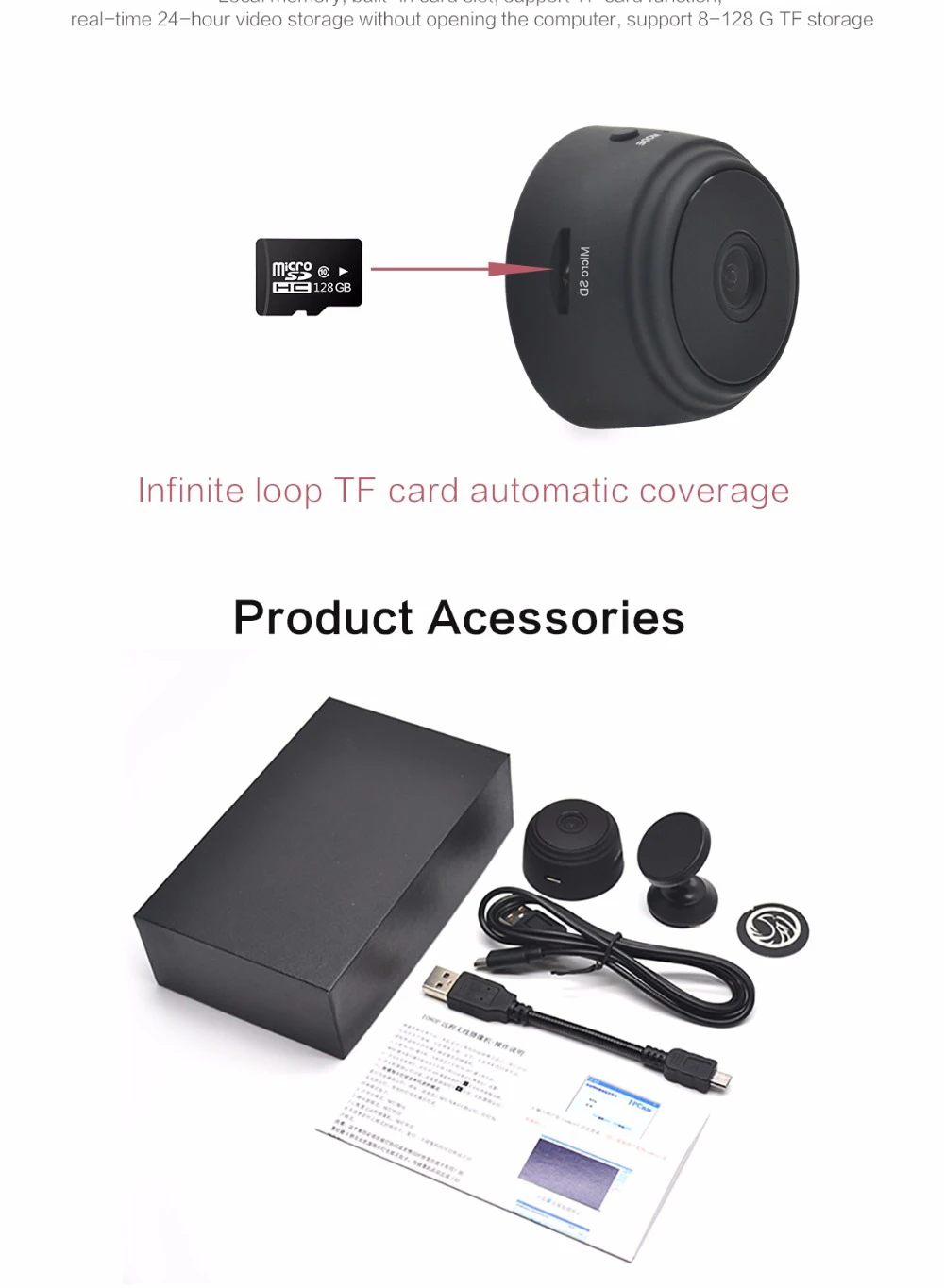 -Основная особенность мини ip-камеры: ● 1080P HD видео, широкий угол обзора 150 ° ● Перезаряжаемая батарея, зарядка во время записи ● Оповещения с активированным движением, ИК Ночное Видение ● Просмотр нескольких изображений камеры, фотографирование и видео ● Поддержка micro SD карты (16-128G) Циклическая запись-sd-карта не входит в посылка ● Совместимость с WiFi, дистанционное воспроизведение