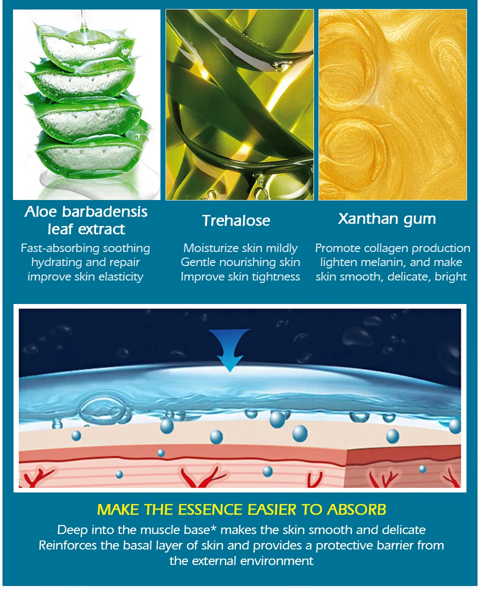 Экстракт листьев алоэ barbadensis, быстро впитывающий, успокаивающий, увлажняющий и восстанавливающий, улучшает эластичность кожи, Трегалоза, увлажняет кожу, мягко питая, улучшает стянутость кожи, ксантановая резинка способствует производству коллагена, осветляет меланин и делает кожу гладкой, Деликатная, яркая эссенция облегчает впитывание глубоко в мышечную базу * делает кожу гладкой и деликатной усиливает базальный слой кожи и обеспечивает защитный барьер от внешней среды