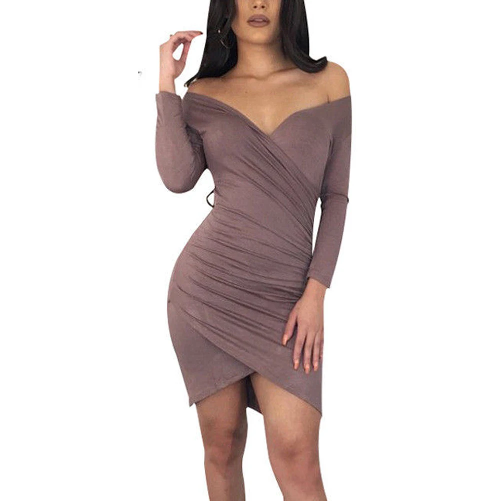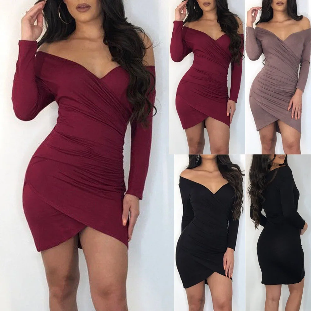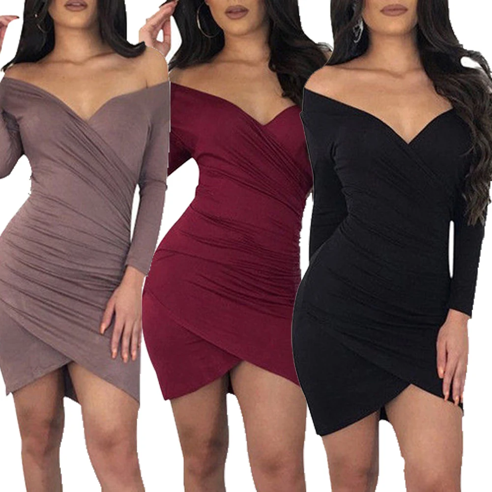 Здравствуйте! Добро пожаловать в наш магазин! Качество на первом месте и самый лучший сервис. Все клиенты-наши друзья. Высокое качество и абсолютно новый 100% Цвет: хаки, черный, винно-красный Новое модное женское облегающее платье с открытыми плечами и v-образным вырезом Материал: полиэстер и спандекс