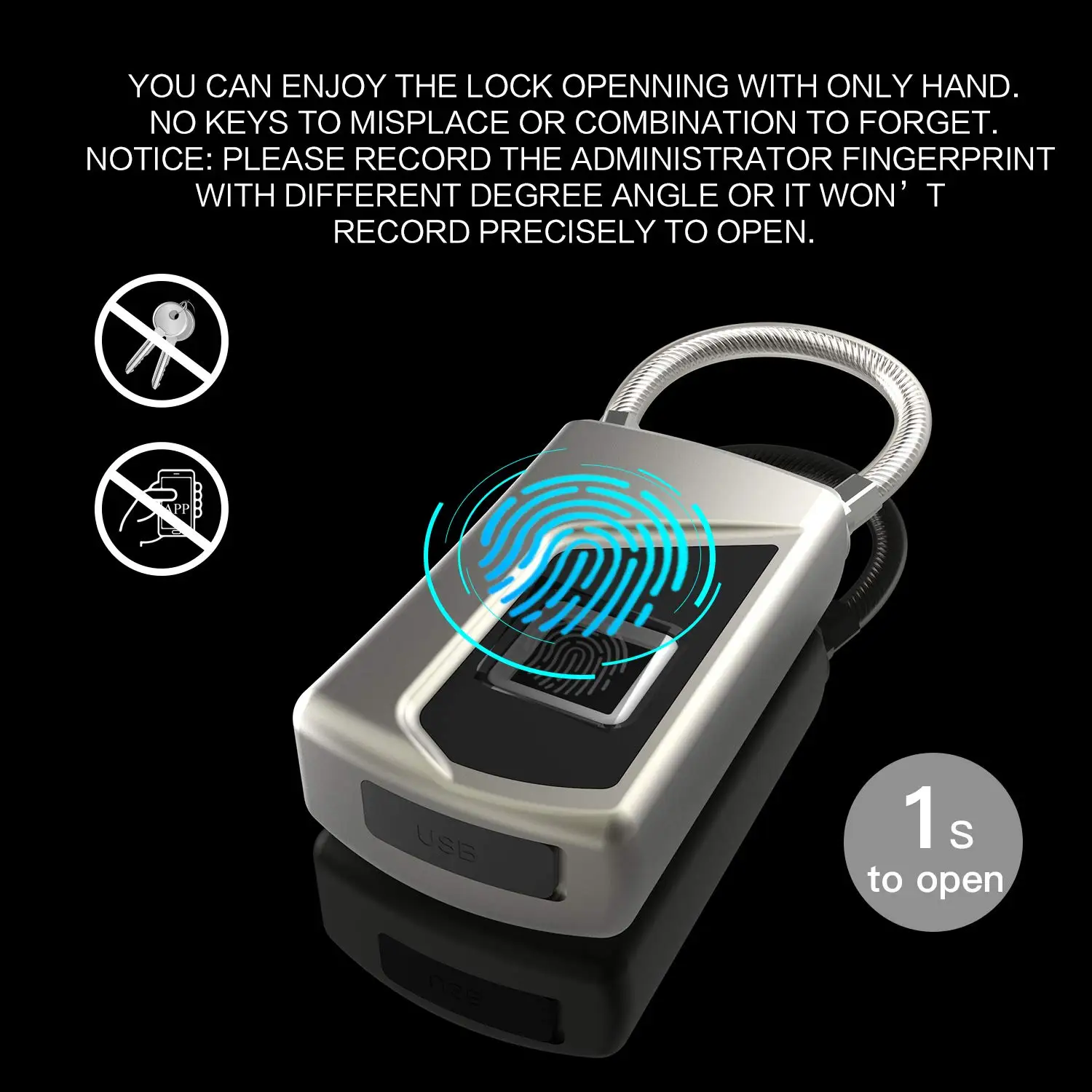 ✔Перед открытием замка отпечатков пальцев протрите воду или пыль на руках. ✔Продукт должен быть полностью заряжен перед первым использованием. ✔Пожалуйста, подтвердите, что блокировка отпечатка пальца заблокирована перед записью отпечатка пальца. ✔Пожалуйста, вытяните веревку замка вручную после успешного разблокирования отпечатков пальцев. ✔Первые и вторые отпечатки пальцев по умолчанию являются отпечатками пальцев от administrator. ✔Удалять отпечатки пальцев и все отпечатки пальцев можно сразу только через оператора. ✔Низкое напряжение в тех случаях, когда voltage≤ 3,5 V, пока индикатор не начнет мигать красным для 15 секунд. Если держать в состоянии низкого заряда батареи, это будет тревожить в минуту. ✔Пожалуйста, внимательно прочитайте руководство пользователя перед использованием.
