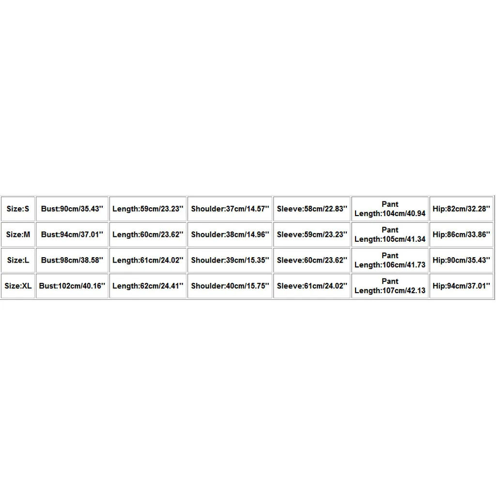 Размер Бюст Длина Плечо Рукав Длина брюк Бедра S 90 см/35,43'' 59 см/23,23'' 37 см/14,57'' 58 см/22,83'' 104 см/40,94 82 см/32,28'' М 94 см/37,01'' 60 см/23,62'' 38 см/14,96'' 59 см/23,23'' 105 см/41,34 86 см/33,86'' L 98 см/38,58'' 61 см/24,02'' 39 см/15,35'' 60 см/23,62'' 106 см/41,73 90 см/35,43'' XL 102 см/40,16'' 62 см/24,41'' 40 см/15,75'' 61 см/24,02'' 107 см/42,13 94 см/37,01''