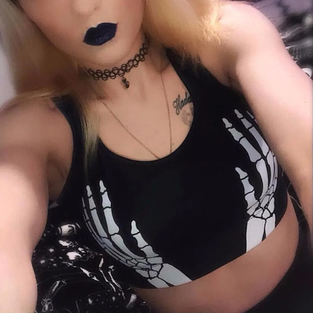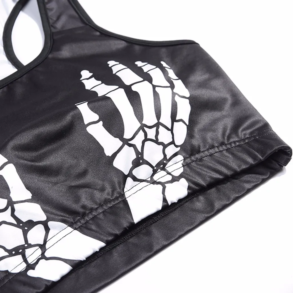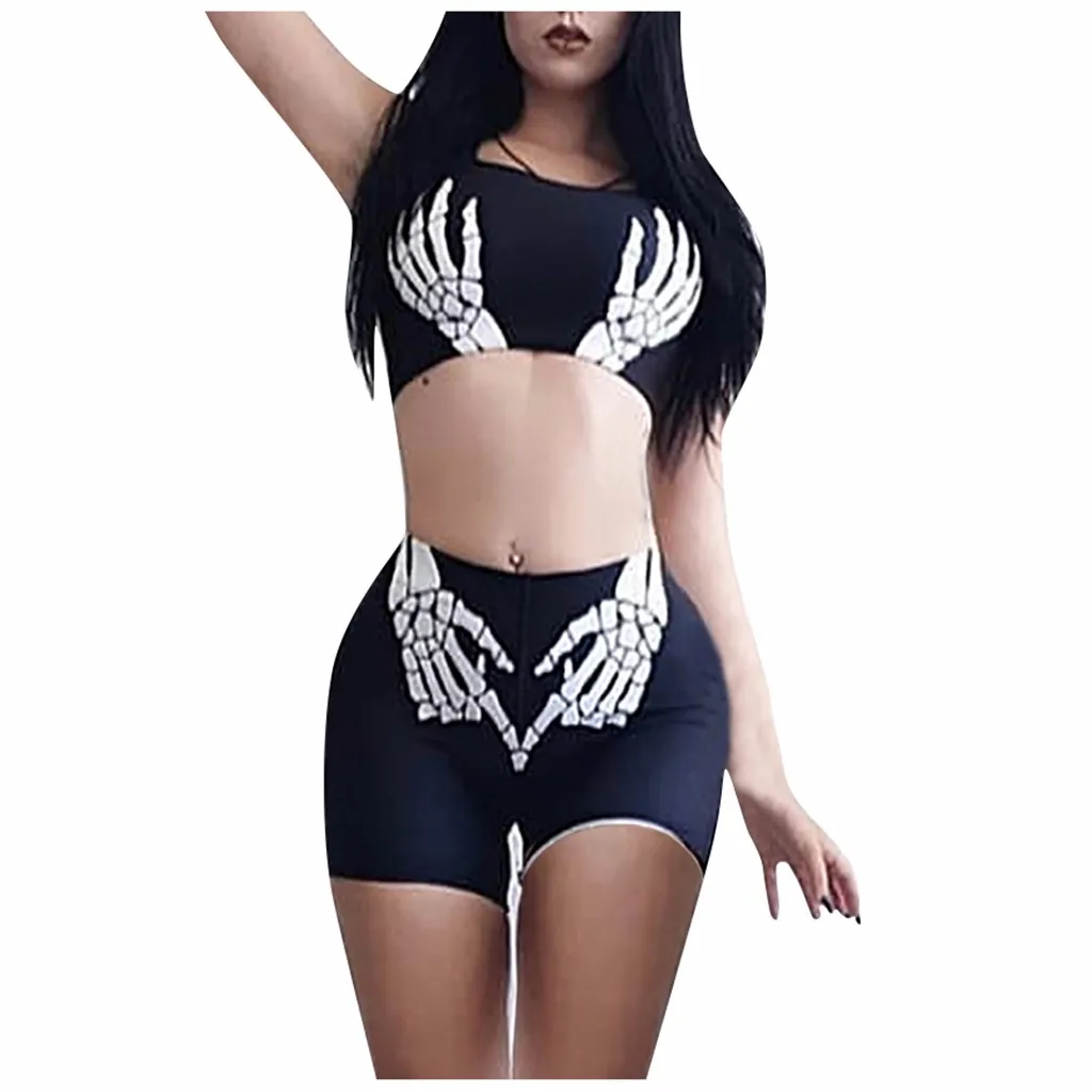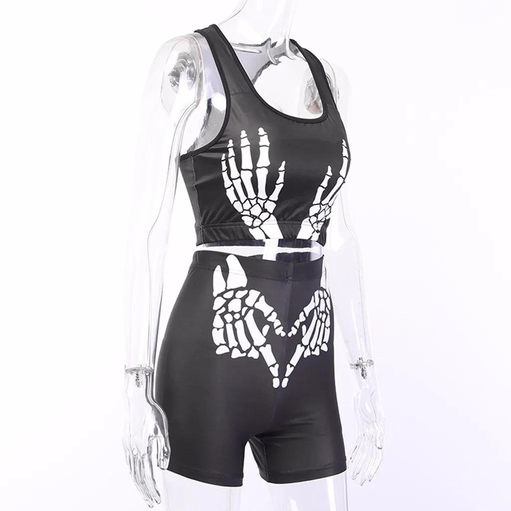 Для женщинКомплект с принтом костей для Хэллоуина, топы без рукавов, узкие шорты, комплект темных цветов