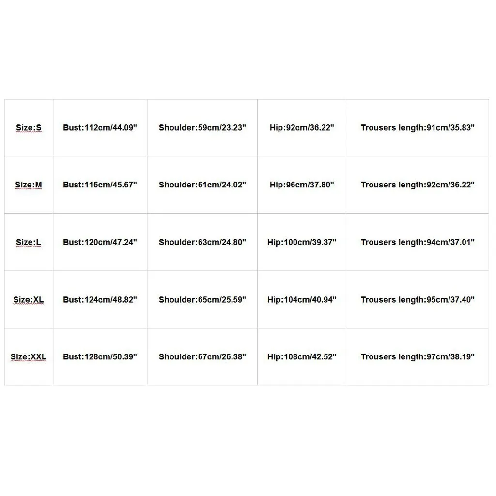 Размер Бюст Плечо Бедра Длина брюк S 112 см/44,09'' 59 см/23,23'' 92 см/36,22'' 91 см/35,83'' М 116 см/45,67'' 61 см/24,02'' 96 см/37,80'' 92 см/36,22'' L 120 см/47,24'' 63 см/24,80'' 100 см/39,37'' 94 см/37,01'' XL 124 см/48,82'' 65 см/25,59'' 104 см/40,94'' 95 см/37,40'' XXL 128 см/50,39'' 67 см/26,38'' 108 см/42,52'' 97 см/38,19''