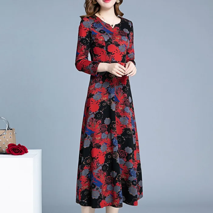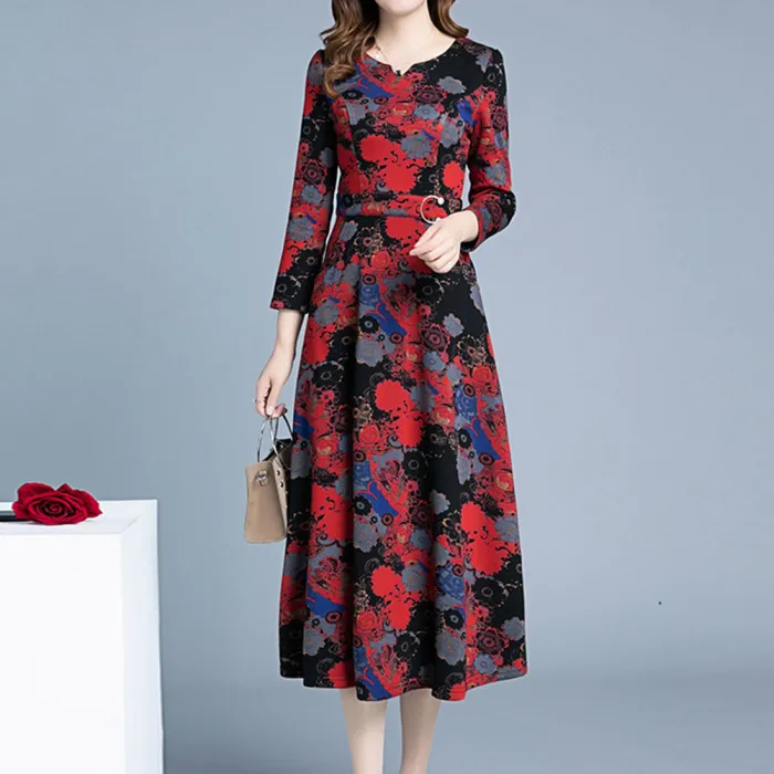 Женское платье с цветочным принтом и длинным рукавом, вечерние платья макси с поясом на талии, GDD99