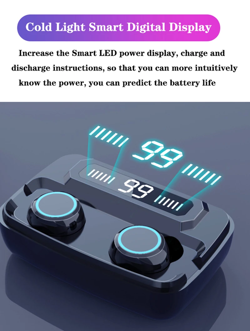 This true wireless Bluetooth earphones feature Bluetooth 5.0 chip, automatic boot pairing, built-in active noise reduction IC, HD call and large capacity lasting battery life. This product features 14.2 graphene diaphragm, professional alloy sound-transmitting network, high-fidelity sound, intelligent noise reduction, 108dB sensitivity, oxygen-free copper voice coil. Two Connection Methods: Single / double free to use, single ear listening to enjoy alone, listening to HiFi stereo in both ears. Smart Touch Operation: Automatic power on/off / answer / reject / last song / next song / call Siri. It ensures 5.0 Bluetooth game without delay, and the electric cabin can be used as a mobile phone bracket and mobile phone emergency power supply for multi-function use.