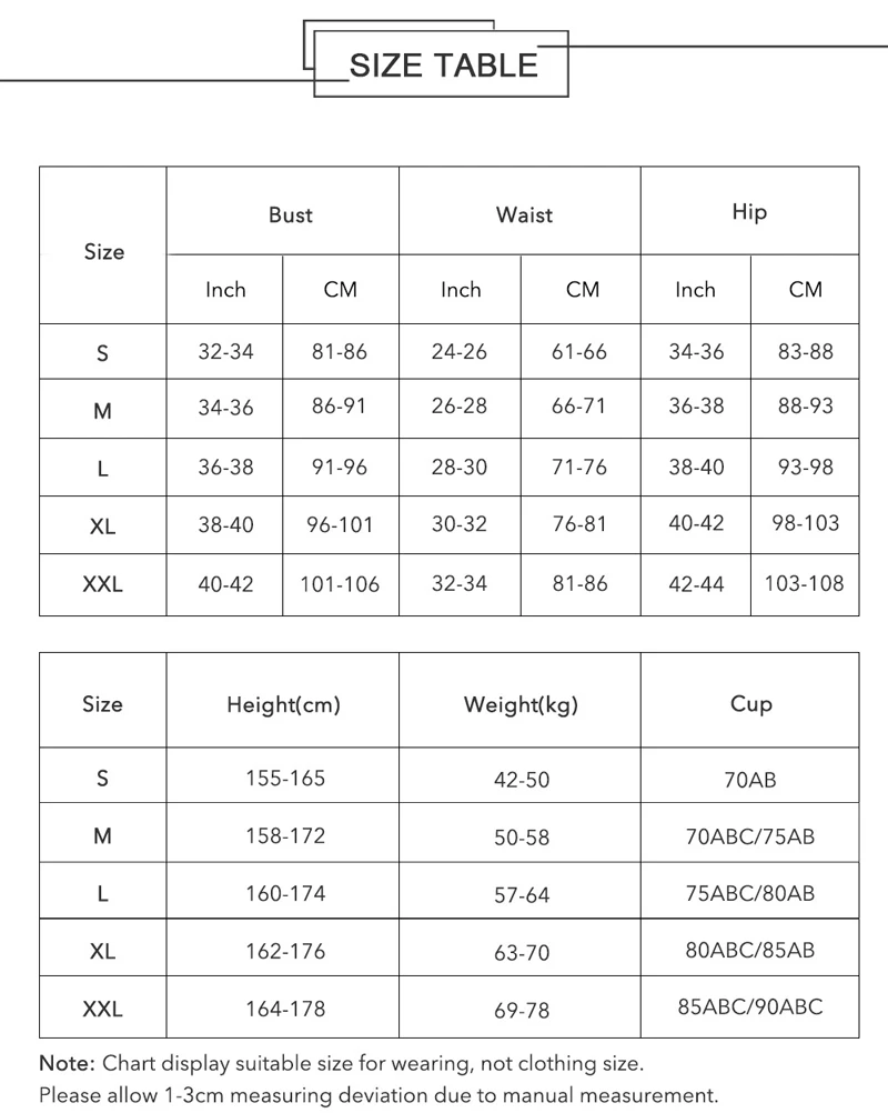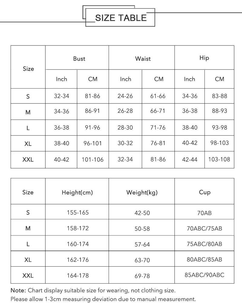 Примечание: цвет может немного отличаться из-за настроек монитора компьютера, из-за разницы в способе измерения возможны отклонения на 1-3 см. Если вы не знаете, как выбрать свой размер, вы можете оставить сообщение о вашей талии и обхвате груди, бедер, роста, чашки, мы вышлем наше предложение для вашей справки. Спасибо за вашу поддержку!