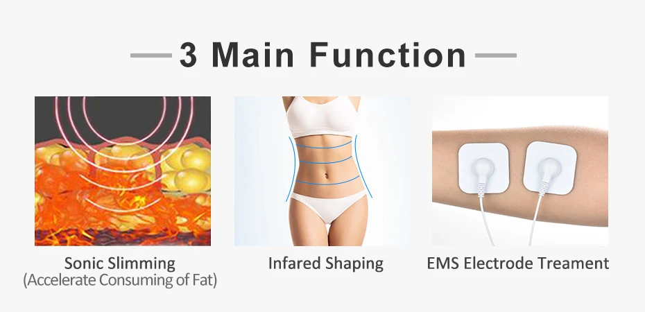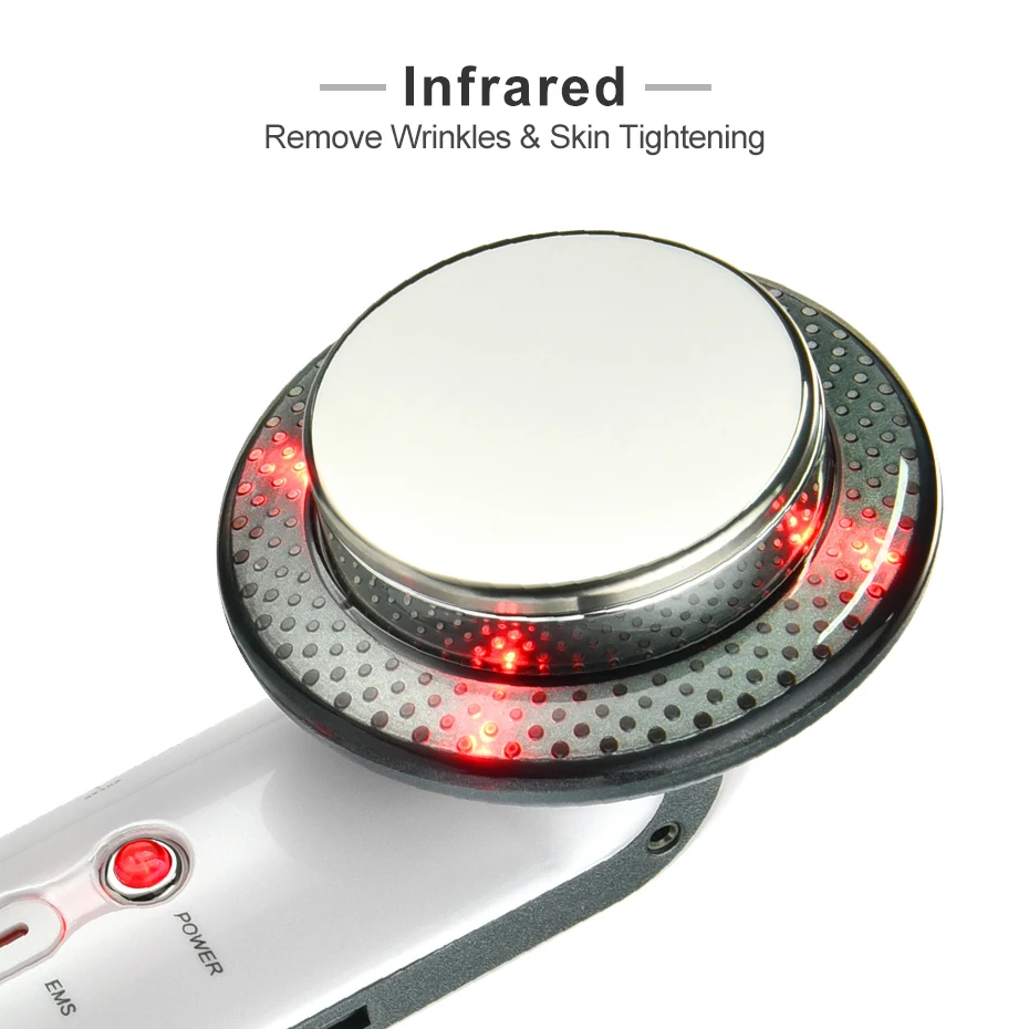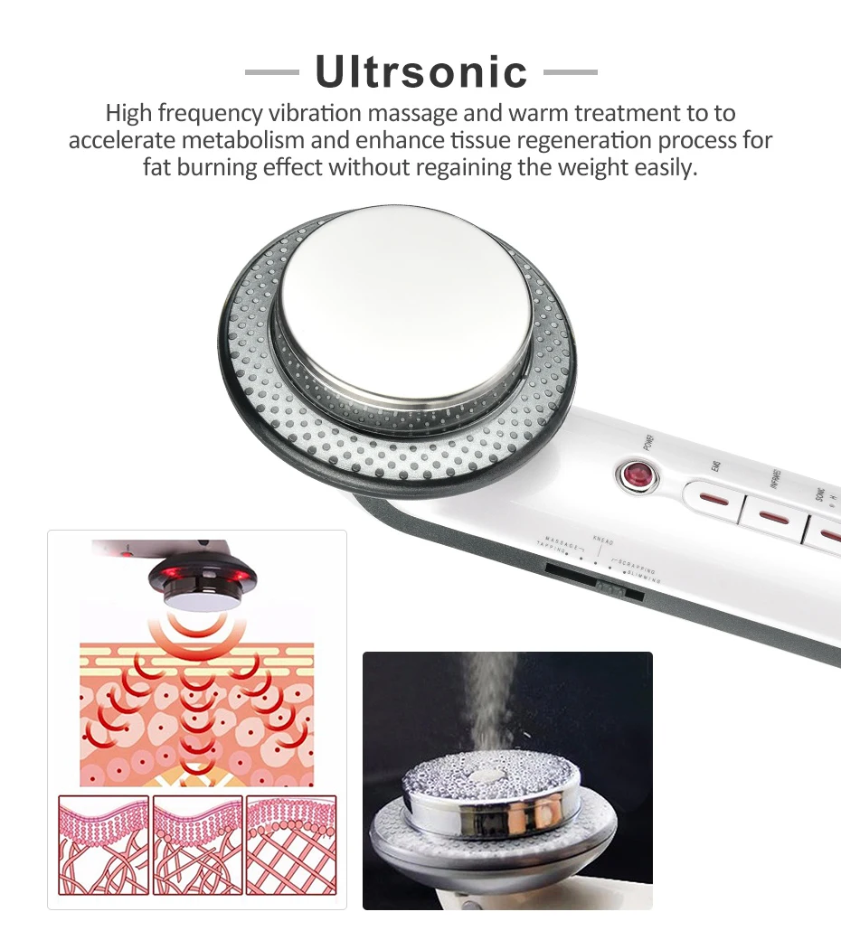 Товар 1 3 в 1 EMS ультразвуковой кавитационный инструмент для тела Массажер для подтяжки лица Технология: EMS + инфракрасный + Ультразвуковой 1. Ультразвуковой: он обеспечит высокочастотный Вибрационный массаж и теплое лечение для ускорения обмена веществ и ускорения процесса регенерации тканей для эффекта сжигания жира, не восстанавливая вес 2. Положительные ионы: свинцовые загрязнения (остатки масла и косметики), глубоко очищают кожу лица или тела. 3. Отрицательные ионы: питание для вашего лица или тела. 4. Красный светильник (длина волны 625 нм): удаление морщин и подтяжка кожи 5.EMS: 5 режимов для (похудения, обрезки, массажа, замешивания, постукивания). Он может заставить ваши мышцы двигаться и улучшить кровообращение, тем самым эффективно потерять вес Примечание: ультразвуковая волна и дальняя инфракрасная область вызовут ощущение тепла для вашей кожи, это нормальное явление, пожалуйста, используйте с легкостью
