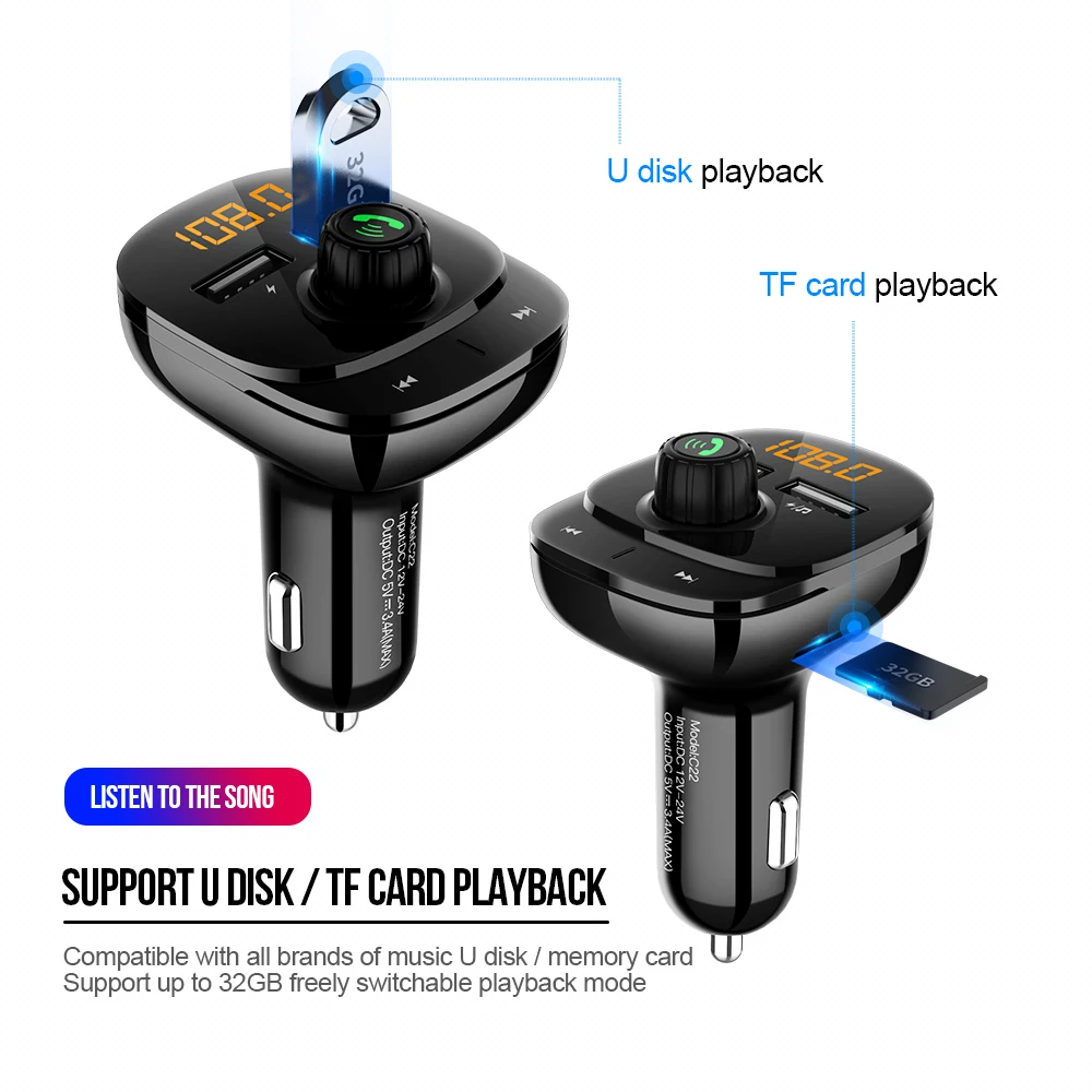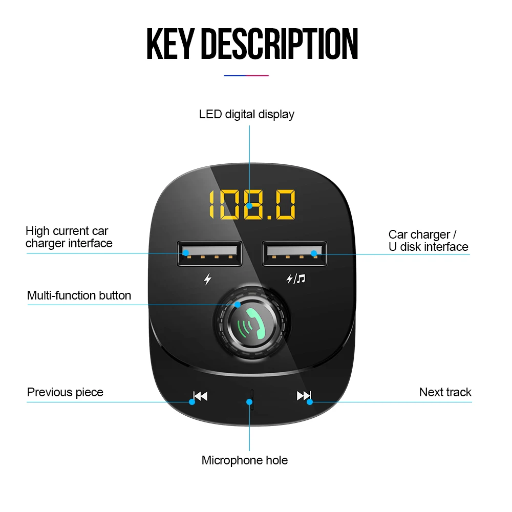 Автомобильный Bluetooth MP3 поддерживает звонки в режиме hands-free, встроенный высокочувствительный микрофон, HSP шумоподавление и подавление эха.