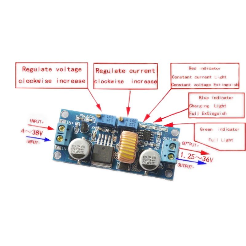 Модуль без постоянной функции не может использоваться для зарядки аккумулятора, потому что полное потребление зарядного устройства большого давления, что приводит к слишком большому току заряда, что приводит к повреждению аккумулятора, поэтому, когда аккумулятор начинает использовать постоянную зарядку при определенной степени заряда, Когда автоматически переключаться обратно на постоянное напряжение зарядки.