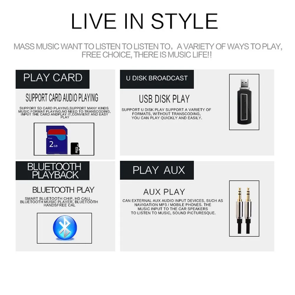 * Admite la función de reproducción de archivos, puedes clasificar las canciones como canciones pop, canciones clasicos, esposas como canciones a los niños les gustan las canciones para crear una carpeta diferente en la tarjeta de memoria para que sea fаcil de reproducir en el interior;