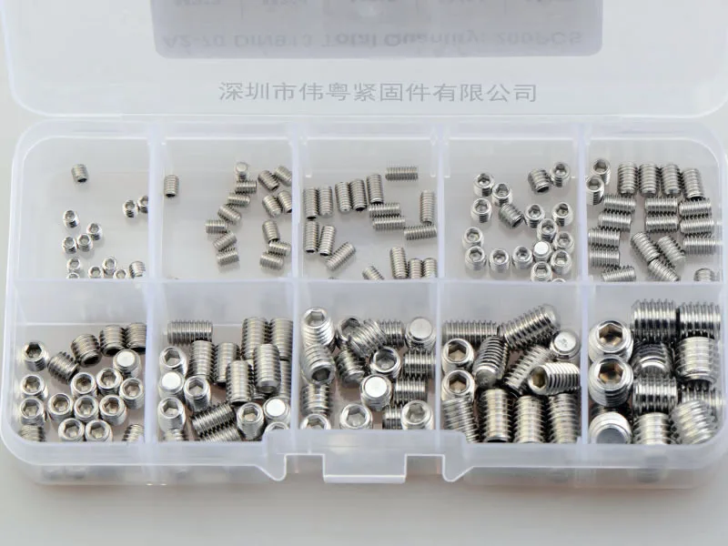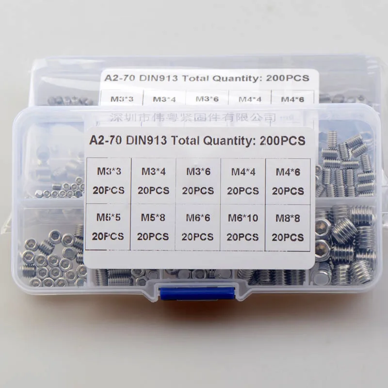 Размер коробки: 13*6,5*2,3 см 200 шт. M3 M4 M5 M6 M8 из нержавеющей стали плоский конец шестигранный Безголовый Набор винтов A2-913 Вес продукта: 143 г M3 * 3 предмета в комплекте 20 шт. M3 * 4 20 шт. M3 * 6 20 шт. M4 * 4 20 шт. M4 * 6 20 шт. M5 * 5 20 шт. M5 * 8 20 шт. M6 * 6 20 шт. M6 * 10 20 шт. M8 * 8 20 шт.