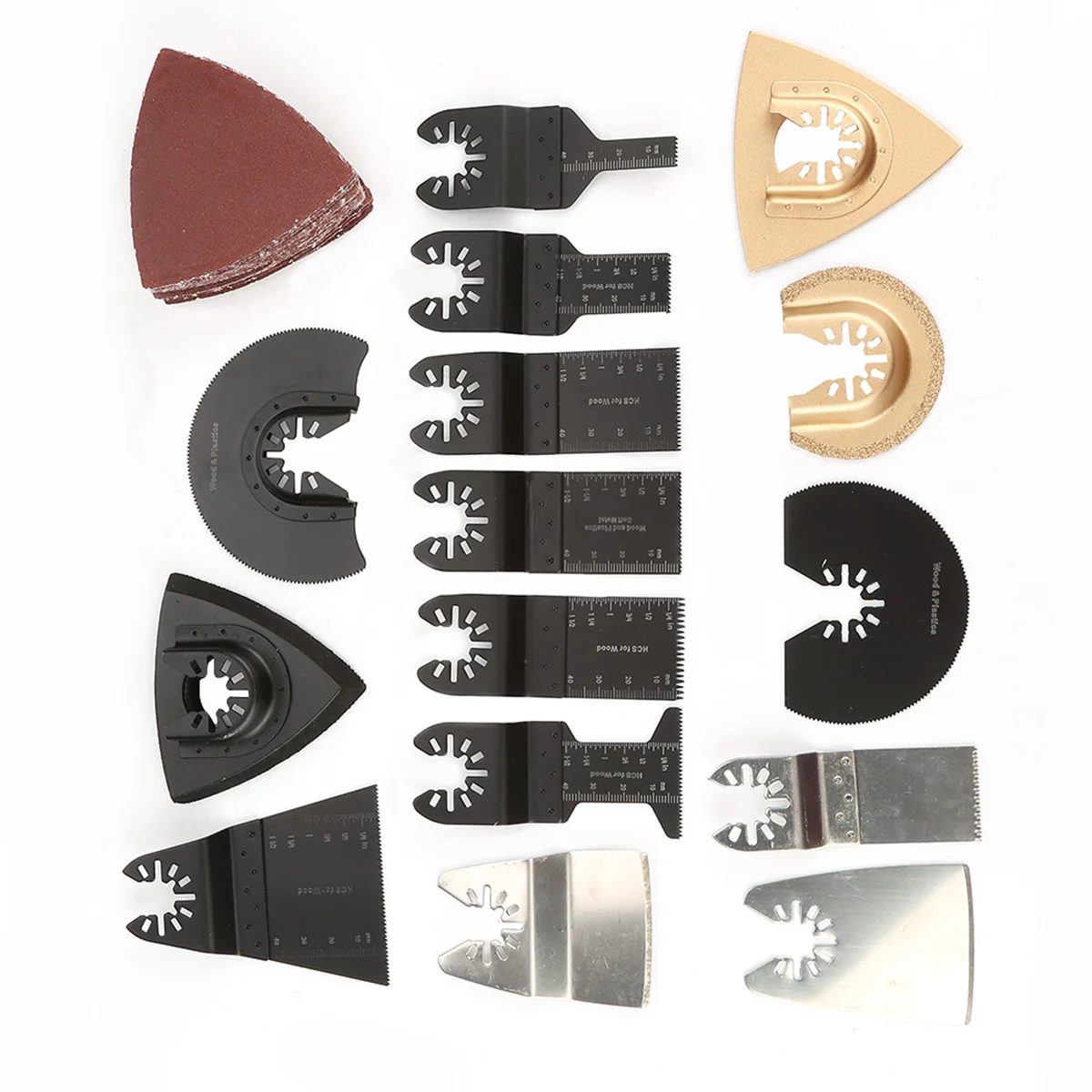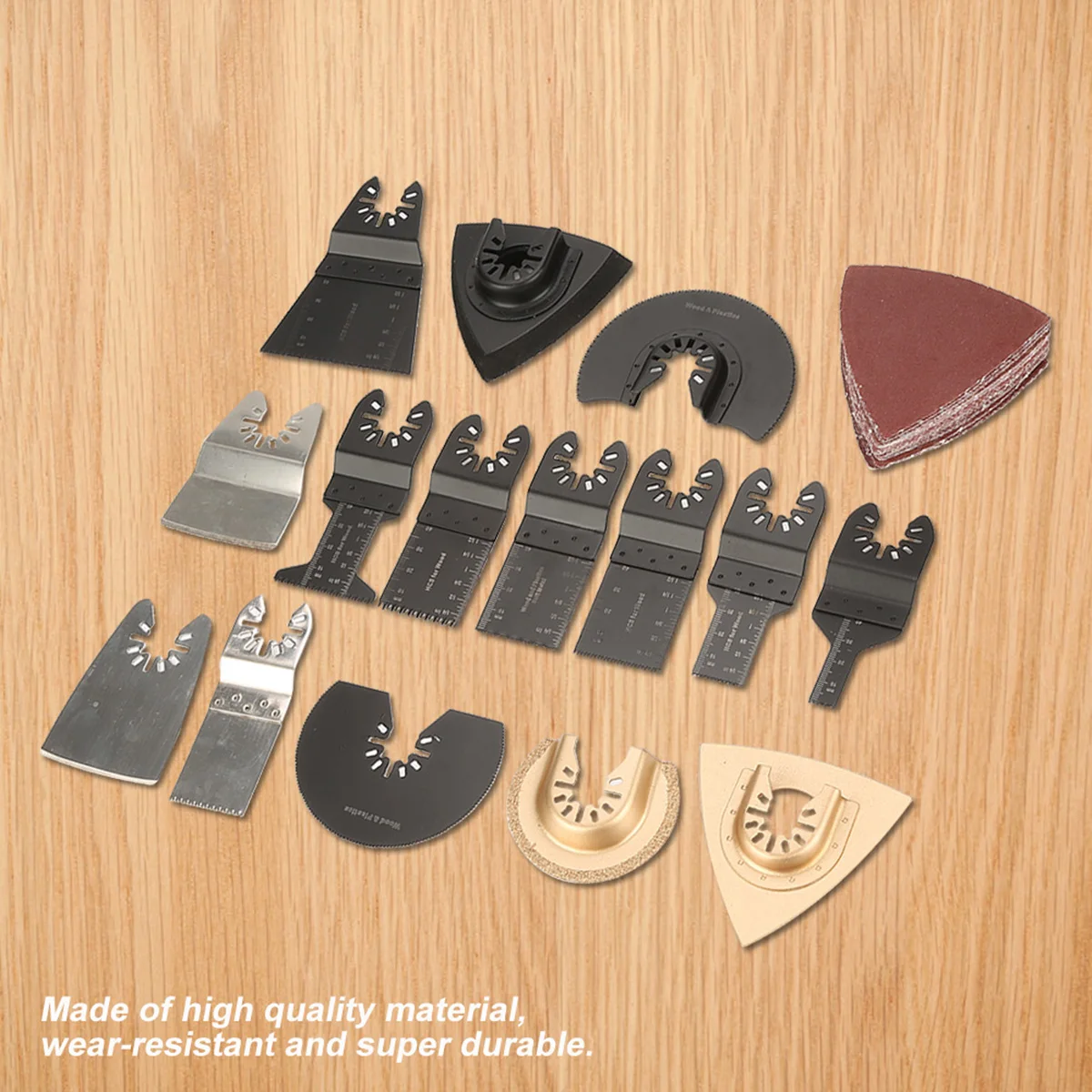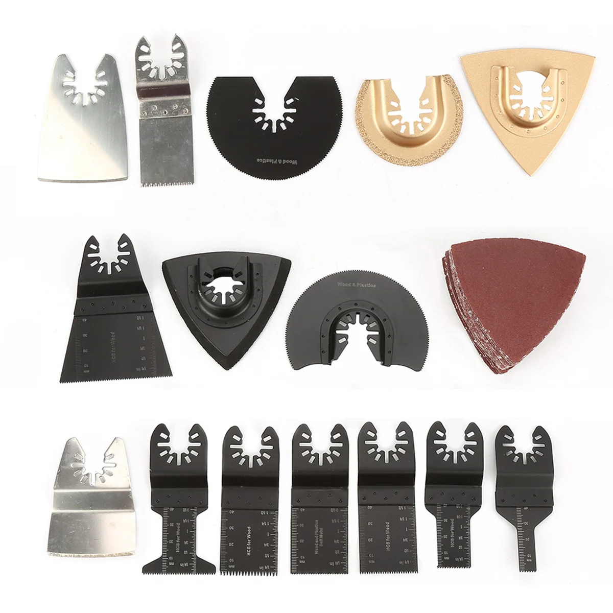 Универсальный Набор осциллирующих пильных лезвий: Может использоваться для резки, соскабливания, шлифования, полировки ковров/кожи/линолеума/картона/дерева/ламината/цемента/гипсокартона (хард рок)/Твердая древесина/пробка и более мягкие пластмассы и т. Д.
