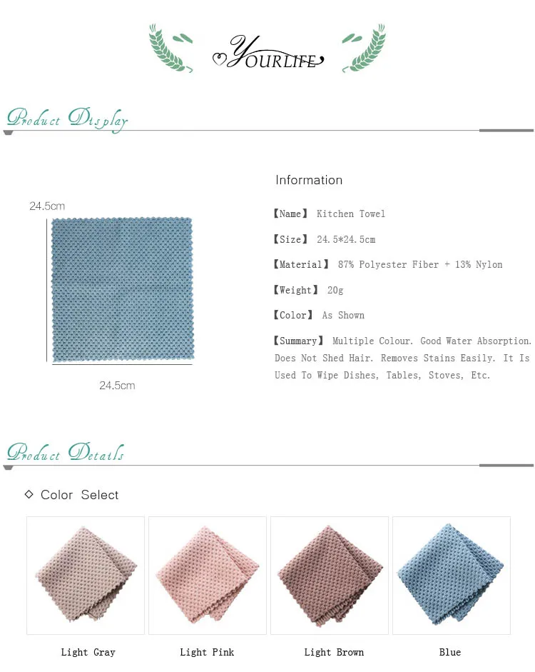 Особенности: 100% новый товар высокого качества. Он имеет мощную функцию дезактивации, прост в использовании на кухне, прост в очистке масляных пятен. Подходит для кухни, отеля и домашнего использования. Технические характеристики изделия: Материал: 87% полиэфирное волокно + 13% нейлон Размеры: 24,5*24,5 см Цвет: светильник серый, светильник, розовый, светильник, коричневый, синий Количество: 5 кухонных полотенец -Примечание: 1. Размер для ручного измерения, может быть погрешность от 0 до 1 см, относится к нормальному явлению. 2. В связи с разной конфигурацией разных мониторов изображение не отображает фактический цвет товара. Если у вас есть какие-либо другие пожелания, пожалуйста, оставьте нам сообщение, чтобы мы постарались помочь вам.