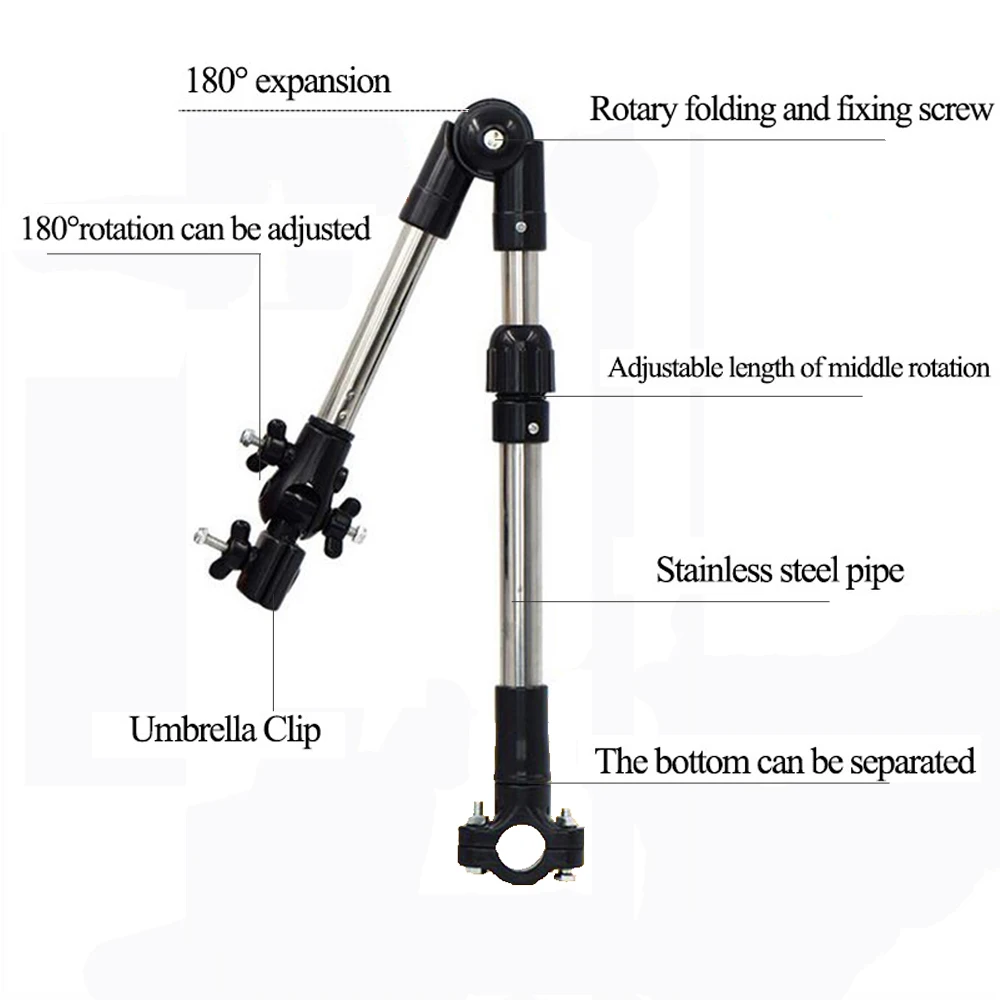 Это изделие является вращающимся велосипедным креслом-зонтиком, держатель для зонтика, рукоятка держателя, которая имеет шарнирное соединение, которое позволяет Зонт быть удлиненным и регулировать на 360 градусов в соответствии с углом Солнца. Простой и практичный дизайн, очень легко устанавливается на руль велосипеда или коляски, что идеально подходит для езды в дождь или в солнечный день, свободная рука Чтобы добавить безопасность. Особенности -Цвет: черный -Материал: АБС-пластик и нержавеющая сталь -Полная длина: около 58 см -Длина в сложенном виде: прибл. 33 см -Диаметр держателя: прибл. 2 см -Регулируемый угол и выдвижная крышка Другим углом. -Легко устанавливается и отрывается, свободные руки, выходя из дома. -Идеальный инструмент для дождливых или жарких летних дней. -Легко крепится к любой Стороне кресла, коляски, ходунки, колоды или скутера простым базовым зажимом. Без зонта, просто подставка Примечание: 1. Пожалуйста, имейте в виду, что замеры и цвет могут немного отличаться, спасибо! 2. Пожалуйста, примите во внимание возможную погрешность в 1-3 см, связанная с особенностями измерения вручную, и убедитесь, что вас это не устраивает перед размещением заказа. Спасибо, что посетили нас!