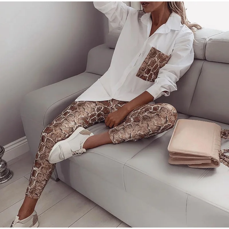 Комплект из двух предметов, женская рубашка со змеиным принтом, костюм, блузка с длинными рукавами и карманами, женские комплекты со штанами, весенние костюмы 2020, тонкие, искусственная кожа, пластик