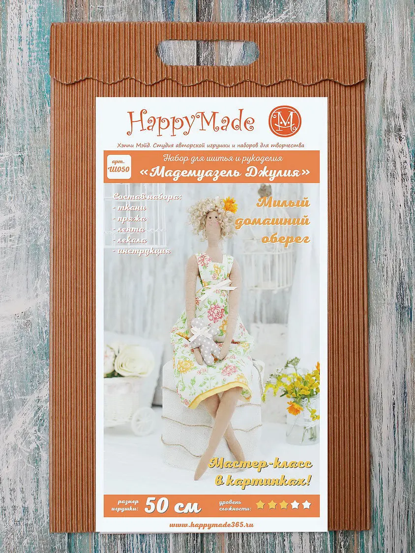 Набор для шитья текстильной куклы HappyMade Ш050 "Мадемуазель Джулия" Размер: высота - 50 см В набор входит: ткань, пряжа, лента, лекала, инструкция. Дополнительно Вам потребуется: ножницы, наполнитель, нитки, иглы. Игрушка, сделанная своими руками - это бесценный подарок Вашему близкому. Она хранит тепло рук автора, она всегда будет дарит радость своими воспоминаниями.