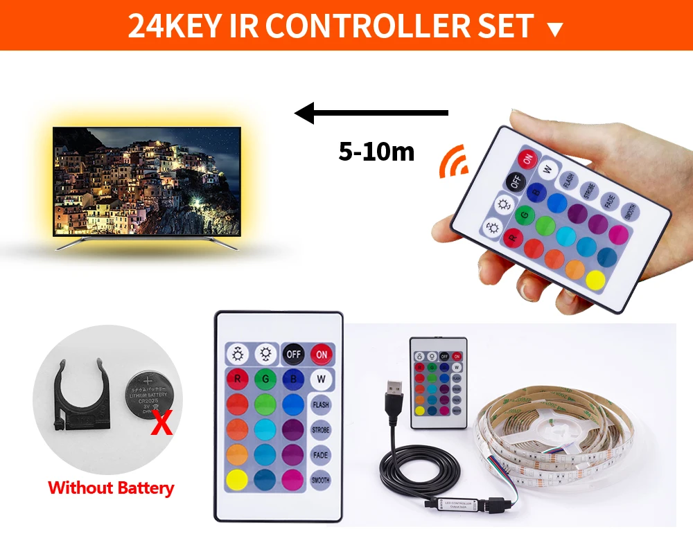 Вариант 1: 1 рулон * 0,5 м/1 м/2 м/3 м/4 м/5 м цветных (RGB) светодиодных лент + 1 шт 24 ключ пульта дистанционного управления (без CR2025 Батарея)