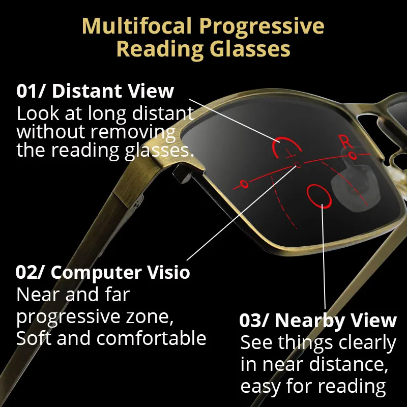 Многофокальные прогрессивные очки для чтения 01/Дальний вид Посмотрите на дальние расстояния, не снимая очки для чтения. 02/прогрессивная зона, Рядом и далеко прогрессивная зона, мягкая и удобная 03/вид рядом Четко видеть вещи на близком расстоянии, легко читать