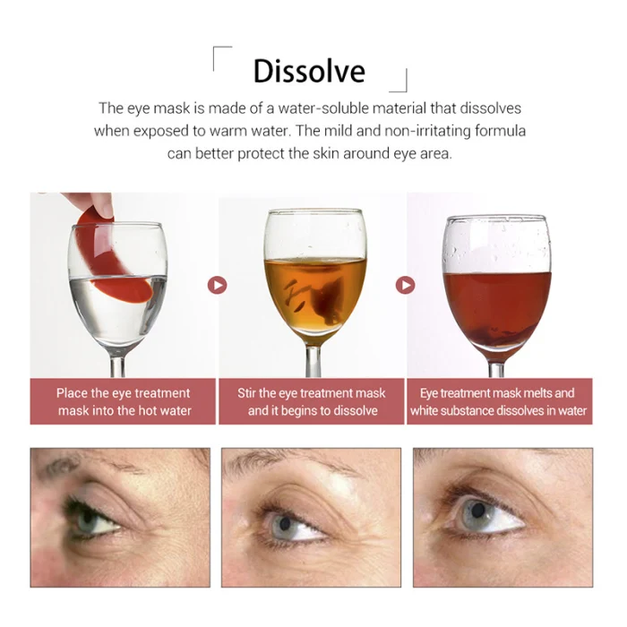 1. Маска для глаз изготовлена из водорастворимого материала, который растворяется при попадании в теплую воду. Мягкие и не раздражающие ингредиенты могут лучше защитить кожу вокруг области вокруг глаз.