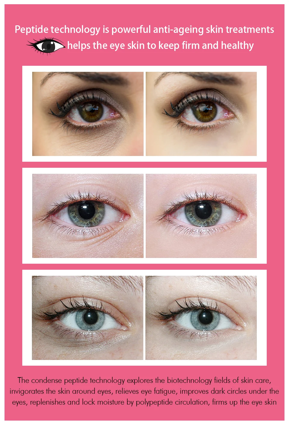 Пептид технологии мощная анти-старения кожи лечение помогает кожи вокруг глаз, чтобы держать фирму и здоровый и раскладывается, может использоваться как пептид технологии исследует биотехнологии полей по уходу за кожей лица, тонизирует кожу вокруг глаз, снимает усталость глаз, улучшает темные круги под глазами, обновляет и замок влаги, полипептид циркуляции, фирмы на кожу вокруг глаз