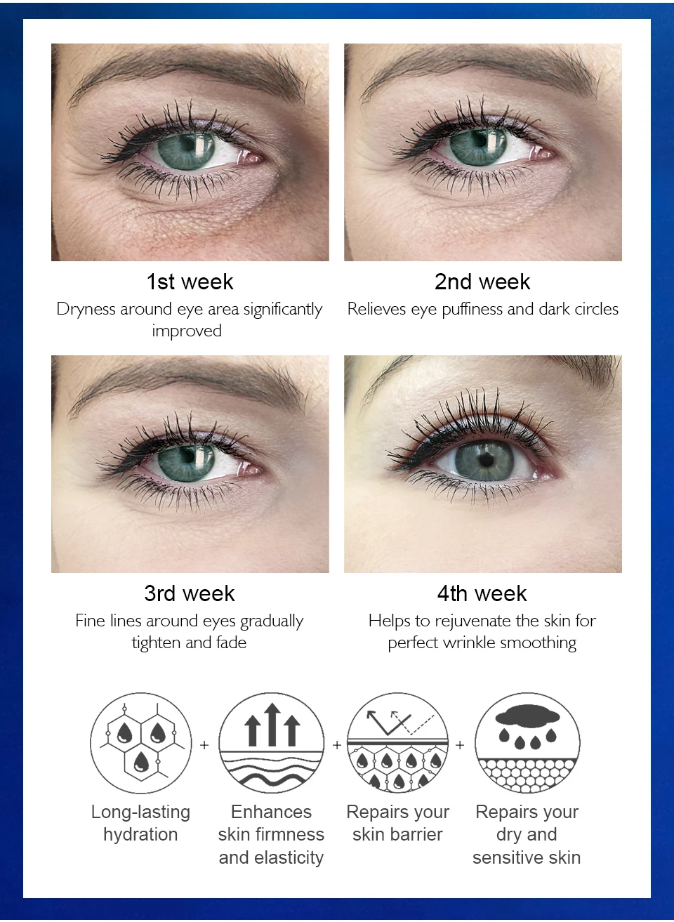 [1st неделю] сухость вокруг области вокруг глаз значительно улучшен [2nd неделю] уменьшает отечность глаз и темные круги [3rd неделю] против мимических морщин вокруг глаз постепенно подтягивают и исчезают [4th неделю] помогает для омоложения кожи для идеального совпадения с плоскостью разглаживание морщин длительное увлажнение повышает упругость и эластичность кожи ремонт вашего кожного барьера ремонт вашего сухую и чувствительную кожу