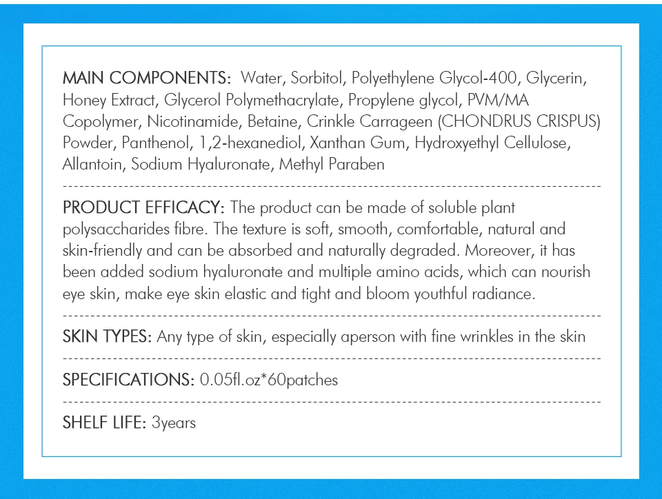 【Maincomponents】: вода, сорбитол, ПОЛИЭТИЛЕНГЛИКОЛЬ 400, глицерин, Мёд экстракт, глицерин, полиметакрилат, пропилен гликоль, ПВМ/MA, сополимер, никотинамид, бетаин, изгиб, карраген (красных водорослей) порошок, пантенол, 1 ,2-hexanediol, ксантановая камедь, гидроксиэтилцеллюлоза, аллантоин, гиалуронат натрия, метилпарабен 【наименование эффективность 】: товар может быть изготовлен из растворимой завод полисахариды волокна. Мягкая текстура ткани, гладкие, удобные, натуральный эндюськина приятная на ощупь и может быть поглощен и естественным образом деградированы. Кроме того, он был добавлен гиалуронат натрия и множественные аминокислоты, которые могут nourisheye кожу, делает кожу вокруг глаз упругой и подтянутой и цветение молодость и сияние. 【Skin цветов】: любого типа кожи, особенно человек с мелкие морщины в кожу 【specifications】: 0.05fl.oz * 60 патчей 【shelf LIFE】:3 года