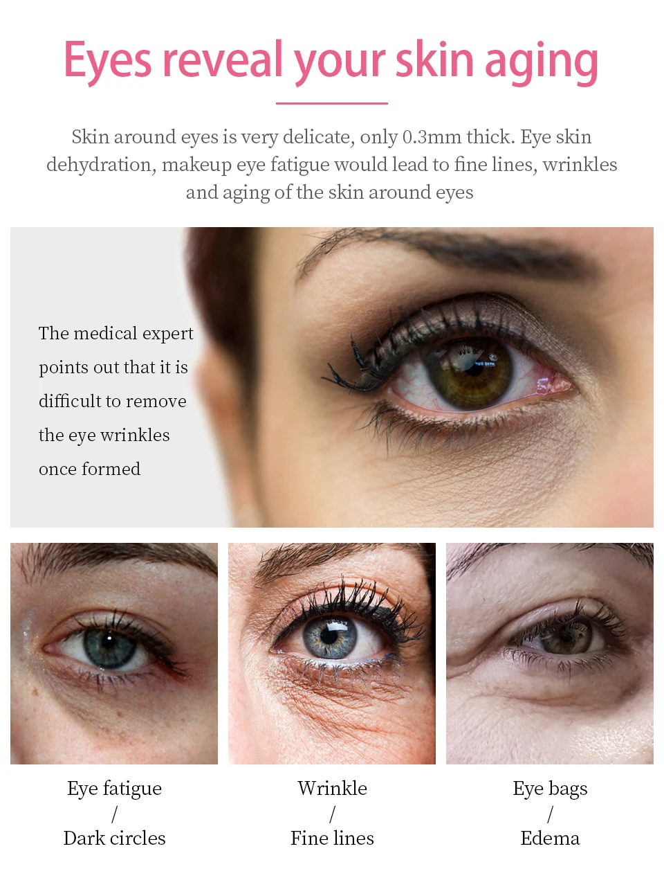 Кожей вокруг глаз очень нежная, только 0,3 мм толщиной. Кожа век обезвоживания, макияж, усталому виду глаз приведет к против мимических морщин, морщин и старения кожи вокруг глаз. Медицинский эксперт указывает на тотгород трудно удалить глаз морщины после образования следов усталости глаз/! Убирает темные круги под глазами, морщин/против мимических морщин, средство против мешков под глазами/отек