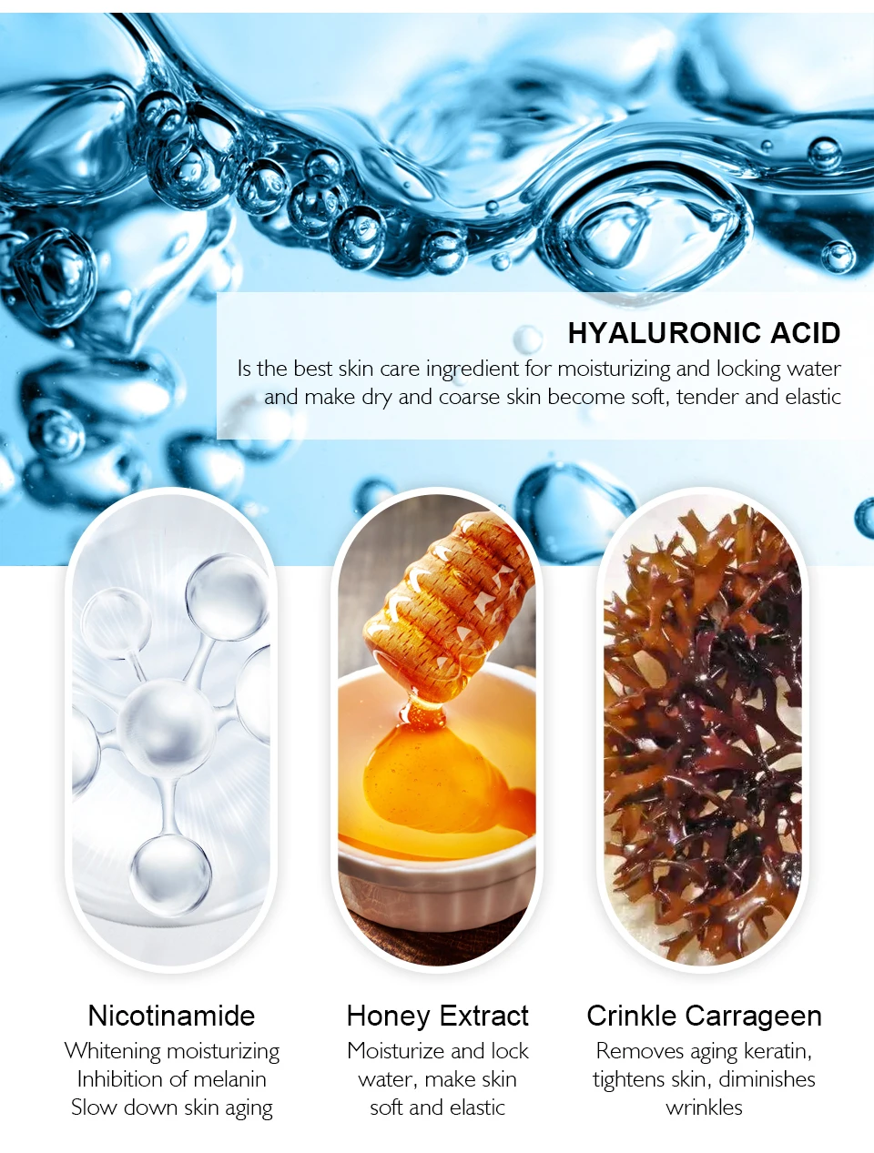 Самый лучший уход за кожей ингредиент для увлажнения и блокировки воды и сделать сухая и грубая кожа станет мягкой, нежной и эластичной [никотинамид] отбеливающей увлажняющей ингибирования меланина Замедляет старение кожи [Мёд экстракт] увлажняют и удержание воды, придают коже мягкость и эластичные [морщинка карраген] удаляет старения на кератиновых пластинах, подтягивает кожу, уменьшает морщины