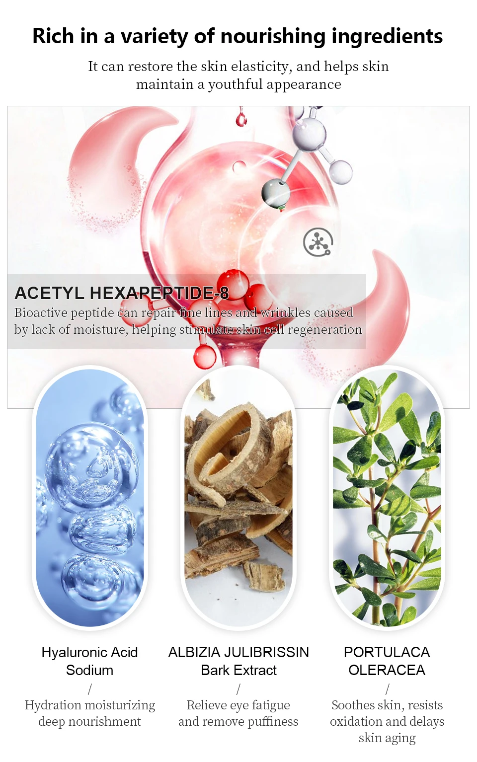 Он может восстановить эластичность кожи и помогает коже сохранять молодость ацетил HEXARERTIDE-8 биологически активных пептид может repairime линии andwrinkles, вызванную недостатком; Отводят влагу и помогает стимулирует регенерацию клеток кожи Гиалуроновая кислота натрия гидратации увлажняющий глубокое питание ALBIZIA снимают усталость глаз и удалить, крем для удаления кругов под глазами и экстракт портулака успокаивает кожу, устойчив к окислению и задерживает старение кожи
